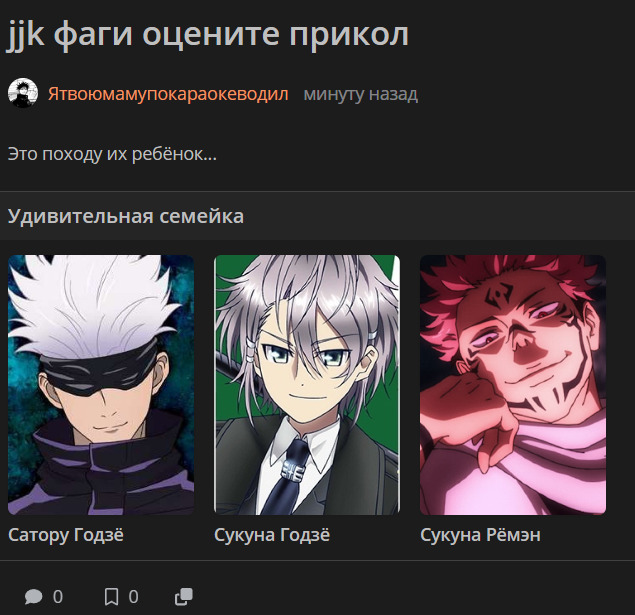 КомментарииKyouichi 8 октября 2015#То чувство, когда твой день рождения тоже 1 декабряSeyko 1 декабря 2015#Так и хочется этому шоте жопу надрать.@cavaliercavalier 2 декабря 2015#@Seyko, хорошенько отшлепатьOkumura Yayoi16 августа 2017#Почему его описания нет на русском ? Anikab 5 июня 2021#Внебрачный ребёнок Сукуны и Годжо@Wee Wee♂mamashinji10 августа 2023#@Aflare, mnenie@AflareAflare10 августа 2023#@mamashinji, ЛОГГ>>>Wee Wee♂ 5 декабря 2023#@Anikab, Опередили меня на три года... Ваше имя случайно не "Скорость"?Соколов Михаил23 декабря 2023#Так это же потомок или даже сын великого Матору Годжосмбмибевре29 марта 2024#гомункулStasYk_ 6 мая 2024#Джек Подрочитель 1 сентября 2024#Сукуна с Годжо зачали ребёнкаDISRESPECT 1 октября 2024#Я ждал здесь фанатов Жужукукайсена!Arsen Yunusov 1 февраля 2025#А ведь у него способности это помесь способностей Сатору и Сукуны, при этом это аниме вышло раньше чем манга Магической битвы, получается что Акутами вдохновился сим произведениемназадТвой комментарийссылкаанимемангаранобэперсонажчеловекOKВставка изображения:OKЦитирование пользователя:OK* Текст