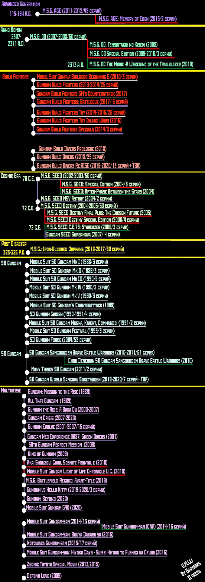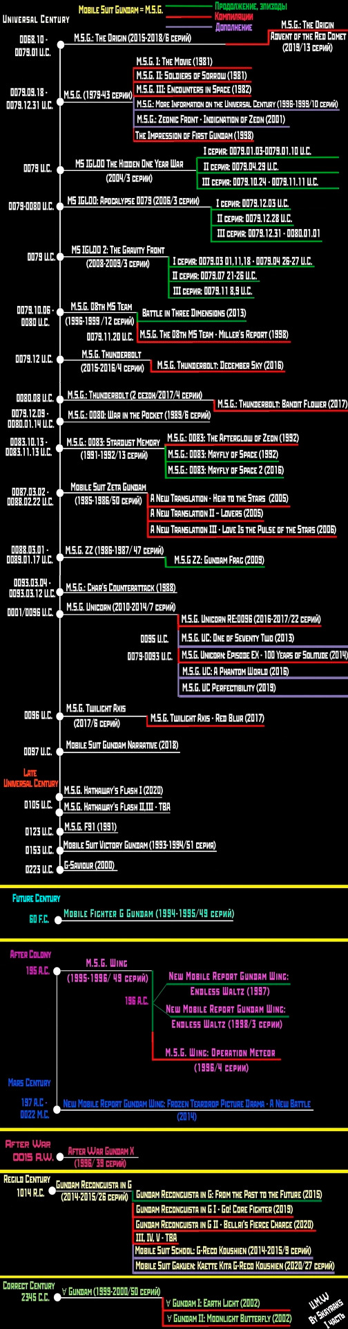 The Origin, который охватывает события с октября 0068 года по 31 января 0079. Mobile Suit Gundam 00. В 2307 году нашей эры ископаемое топливо практически исчезло, и начинается добыча солнечной энергии. Был построен энергетический комплекс по переработке солнечной энергии, связанный с Землёй тремя орбитальными лифтами, каждый из которых находился под контролем одной из лидирующих мировых организаций. Следующие века, такие как: Будущий, После Колоний, Марсианский, После Войны, Правильный Век, Век Возрождения — некоторыми условностями связаны с Универсальным, но точного временного соответствия между ними нет. Сходство можно увидеть по некоторым вещам, например, в карте мира определенного временного этапа. Но век После Стихийного Бедствия тоже имеет схожую карту с сериалом 1979 года, однако никак не связан с Универсальным веком. Теперь подробнее о каждом. Временная шкала Anno Domini получена из обозначения лет после рождения Христа. История разворачивается примерно в 2300 году. Для решения проблемы глобального топливного кризиса был построен орбитальный лифт, и наладилось производство фотоэлектрической энергии. В отличие от Ньютайпов, здесь будут Новаторы — люди, которые эволюционировали, чтобы использовать квантовые мозговые волны в Гандаме и инноваторы, которые являются искусственной генетической версией истинных новаторов. Вместо частиц Миновского применяются GN частицы.