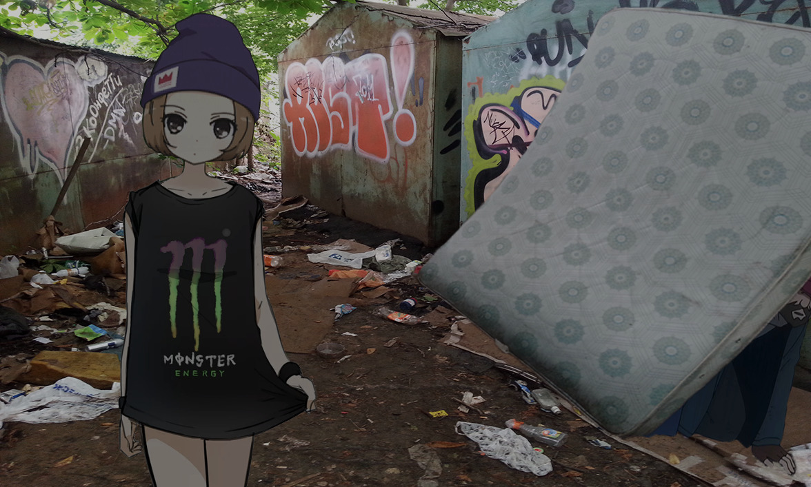 Хах, как же это забавно и мило. Умная няша, которая не желает подчиняться нормам общества и находит интересными мысли бездомного. p.s её футболка ассоциируется у меня с black monster. Сделал «нечто». Уж простите за мой фотошоп..