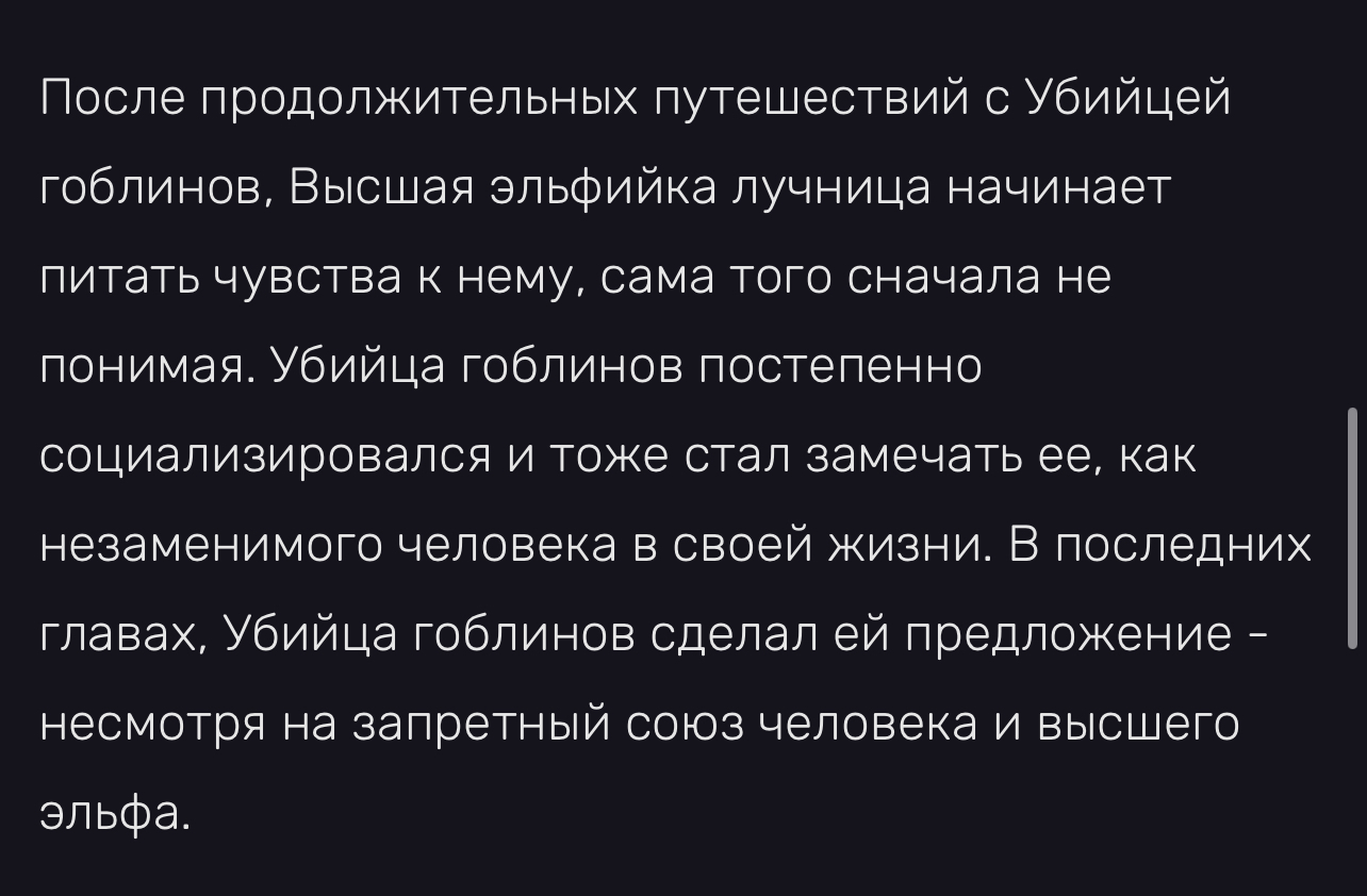 @cпящий, в настолке по ГС говорится, что у эльфов сеттинга (по крайней мере у высших) взросление не привязано к возрасту, а происходит по мере личностного роста и совершенствования мастерства. Так что нежелание поднимать стрелы гоблинов как раз более чем реалистично для вчерашней соплячки, которая две тысячи лет за зайцами бегала."фото на паспорте слабое, лучше вот ава из фейсбука"