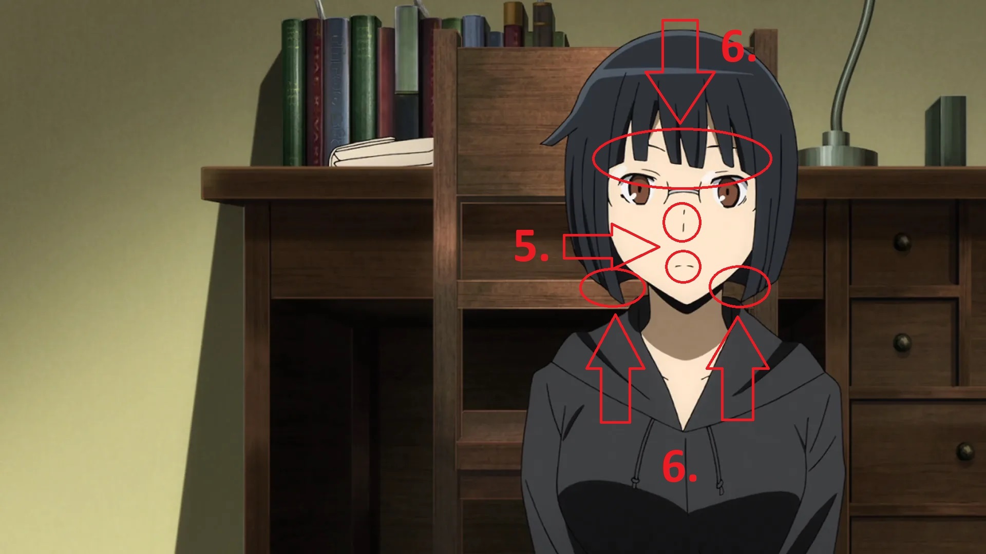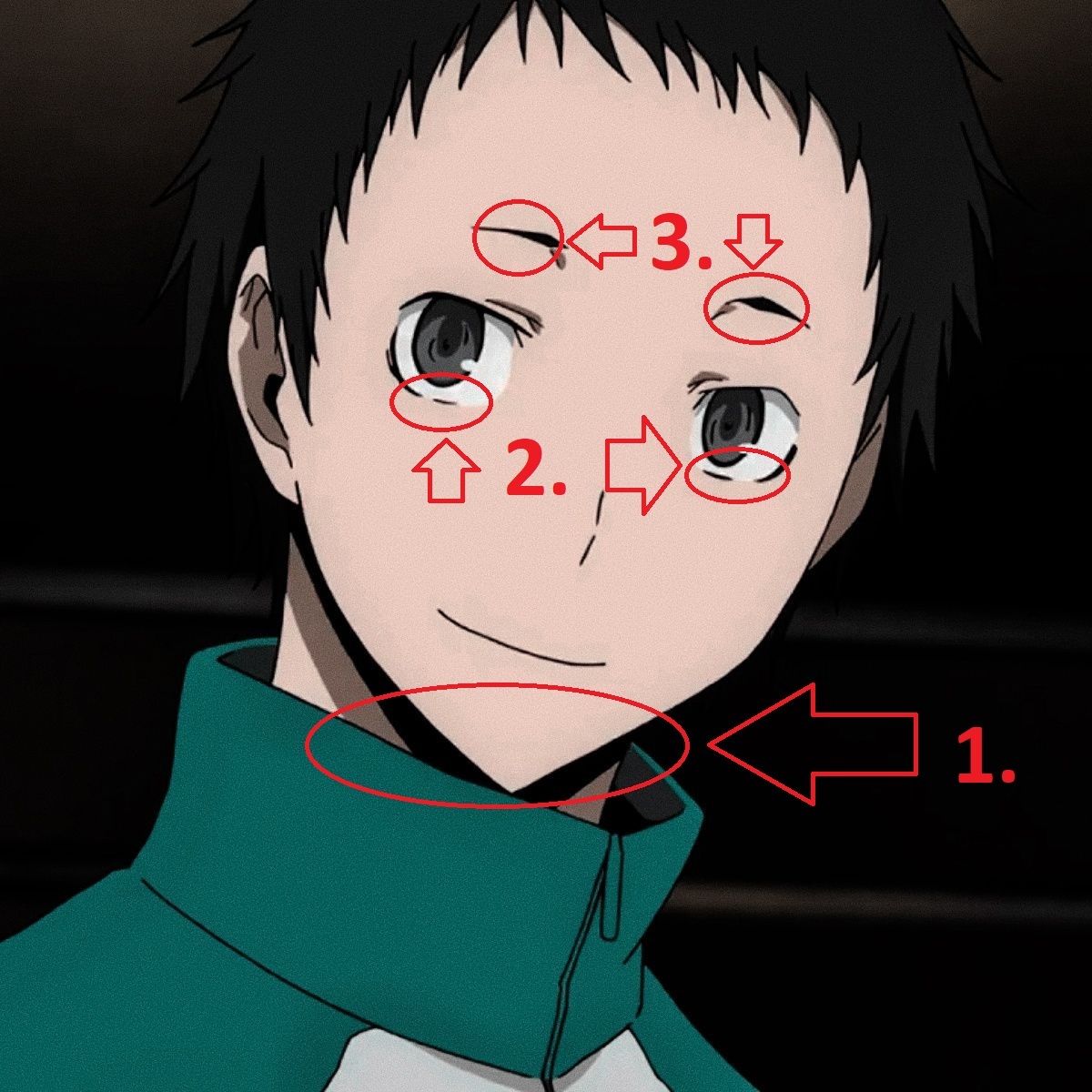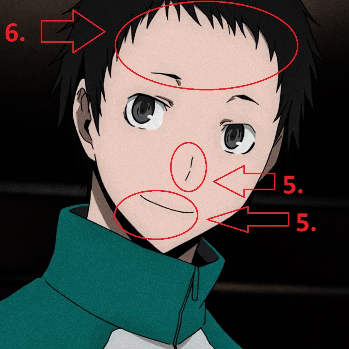 1. Типичный овал и сердечко с плавным, сужающимся к подбородку контуром. У мужских персонажей в аниме (как у Микадо) обычно более квадратная или прямоугольная форма с выраженными скулами и угловатой линией челюсти. Да и линия подбородка у Анри острый, маленький и мягкий. У того же Микадо подбородок будет шире и четче очерчен.