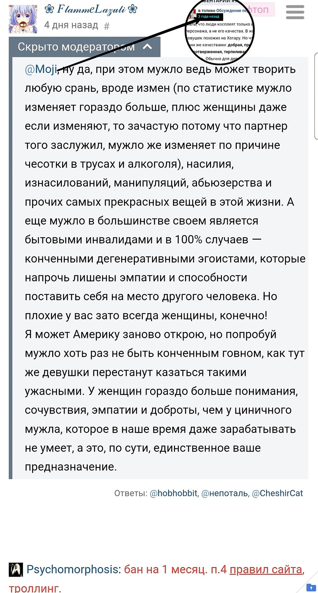 @CheshirCat@Love Alina, я вчера в один зашел так у меня чуть приступ эпилепсии не случился@❀ 𝐹𝓁𝒶𝓂𝓂𝑒𝐿𝒶𝓏𝓊𝓁𝒾 ❀, могла бы и за волшебниц проголосовать перед тем как опять в бан улететь@Love Alina,@Ринне Соногами@CheshirCat, отмена. Не успела. Я просто перепутал с другим красивым ником 𝒾𝓏𝑒𝒻𝓇✩𝒸𝑒𝓃@Moji@Remanga enjoyer, Рад стараться. Только не понял, что тут вообще было. Глянул, оказалось кто-то заагрился на 100-летней давности пост.@Remanga enjoyer@Moji, Да это либо совсем странная женщина, либо тролляка.Хотя столько букв от него... Даже и не верится в вариант троллинга.
