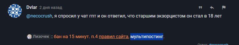 @Dvlar,@Dvlar,@Dvlar@necocrush, судят по ситуации в школе в последнем сезоне - ну типа несколько классов, раз их одновременно посвятили в экзорцисты. Короче, я думаю не больше 5 лет@necocrush, блин, 3 минуты назад узнал, что ей 16 в тот момент когда он - старший экзорцист первого класса@necocrush, я спросил у чат гпт и он ответил, что старшим экзорцистом он стал в 18 лет@necocrush@Dvlar, спасибо, значит, всего 2 года разница@Лизочек ты что охренела? я никого не троил. Я требую твоих извенений за незаконный бан@leprosor@Dvlar, так и не за троллинг забанили@Dvlar@leprosor, пиздец охуели. 2 разар сообщение подря написал - всё, бан. Нахуй пусть идут@leprosor@Dvlar, 3А Megumi HayashibaraМэгуми Хаясибара, как всегда, шикарна