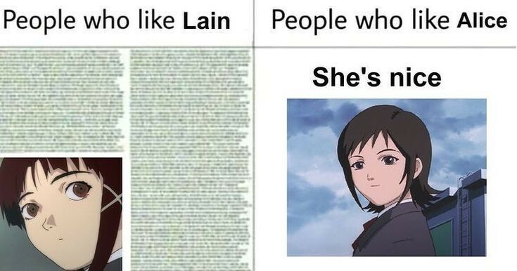 Очень нравится её забота о Лейн, если бы не она, скорее всего Лейн вовсе изолировалась от мира, также она выделяется от других "подруг" Лейн, которые сначала её чуть ли не высмеивали, жаль что её не очень хорошо раскрыли, хотелось бы узнать её получше