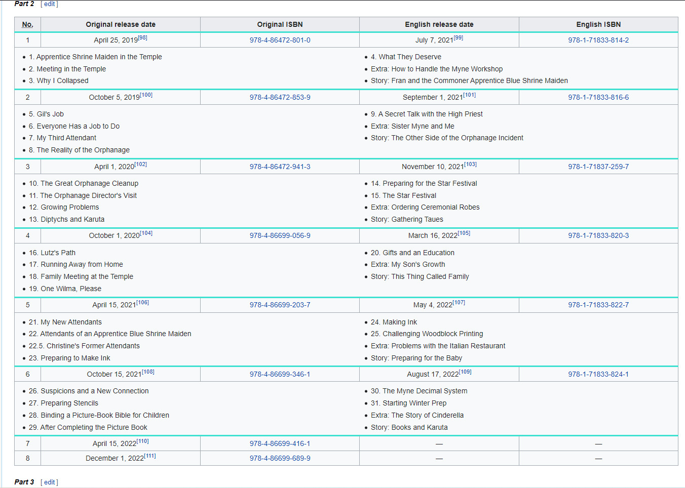 Комментарии10Shadow01 9 мая 2020#Где можно почитать?@IgnisovIgnisov29 мая 2020#@Animeshik2019, на мангадексе англ версия есть первые 3-4 пока что главы@10Shadow0110Shadow0130 мая 2020#@Ignisov, ссылку скинуть можешь?@Tedeika³Tedeika³30 мая 2020#@Animeshik2019, mangadex.org10Shadow0110 декабря 2022#youtube - Тизер очередного Тома Ранобе и Манги и Fan Book и Мерча и тд10Shadow0110 декабря 2022# Про Все Тома 2 части Манги - Всего 8 Томов Манги на данный момент en.wikipedia.org/wiki/Ascendance_of_a_BookwormМакатцу 3 мая 2023#Так, я запуталась. Как "часть вторая" может быть онгоингом, если уже выходят третья и четвертая? И почему третья вышла раньше второй?@hobhobbithobhobbit 3 мая 2023#@Макатцу, первоисточник - ранобэ, а мангу начали рисовать после аниме. Видимо, кому-то хотелось рисовать Розмайн больше, чем Майн.@МакатцуМакатцу 3 мая 2023#@hobhobbit, Спасибо за пояснения. Это значит, что я не смогу начать третью часть, пока не закончится вторая?@hobhobbithobhobbit 3 мая 2023#@Макатцу, да. Рекомендую почитать ранобэ, оно годное и, слава богу, не заброшенное.@МакатцуМакатцу 3 мая 2023#@hobhobbit, Спасибо. Прочту. (Ух ты, там глав даже больше чем в Ублюдке)@hobhobbithobhobbit 3 мая 2023#@Макатцу, рекомендую перевод Фражуза, так как он самый грамотный. Да и перевел он дальше всех, за исключением надмозгов.Фражуз23 мая 2023#Интересно, что вы называете переводом Фражуза, учитывая, что на ранобелибе я выкладываю обе ветки перевода, но ни для одной не являюсь переводчиком...назадТвой комментарийссылкаанимемангаранобэперсонажчеловекOKВставка изображения:OKЦитирование пользователя:OK* Текст