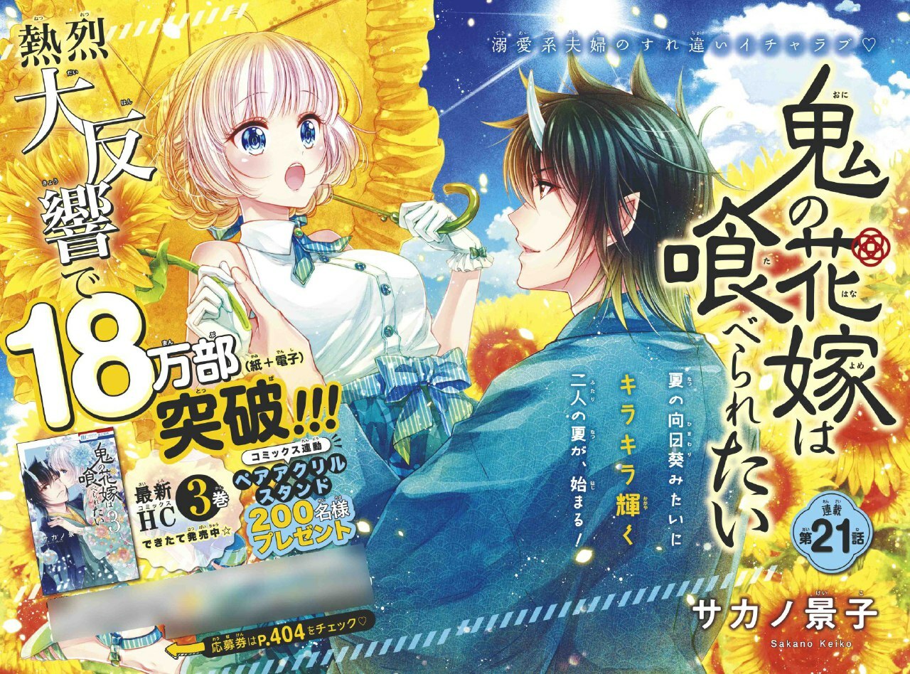 Цветная иллюстрация «Oni no Hanayome wa Taberaretai» из 21-го выпуска Hana to Yume.