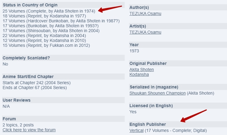 @mokino, количество томов оригинала вас вообще волновать не должно, потому что, как правило, у такой манги куча переизданий и выкладывают на английском/переводят на русский именно их, скомпонованы они могут быть как угодно уже. Ориентируйтесь по тому же Baka-Updates: www.mangaupdates.com/series.html?id=6421 В издании от Vertical вся манга уместилась в 17 томов, прочитаете их - комплитнули.