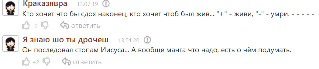 Очень долго думала над оценкой. Произведение шикарное. Жесточайшая форма психопатии без украс, романтизации и пожалейки. Но это произведение такое жуткое и отталкивающее... именно такой и является психопатия как таковая - жуткой и отталкивающей. За полное раскрытие этого страшного недуга гигантский лайк, но читать было тяжело, именно из-за натуралистичности. Опыт тесного взаимодействия с реальным психопатом, расти с ним с детства вместе, видеть как он медленно раскрывается в своём безумии, это наложило некоторый отпечаток. В каждой странице этого произведения я узнавала его и его мировоззрение. Он так долго и хорошо притворялся нормальным, что становится страшно от того сколько таких же гуляет по улицам, а мы и не догадываемся. До убийств он не дошёл, и надеюсь не дойдёт. Но я точно знаю, он сделал бы это с удовольствием, если бы не боялся наказания. В общем, пока читала, тошнило не от мяса, а от страха и тяжёлых воспоминаний при прочтении. Это настолько близко к реальности... Оценку поставила высокую, но больше никогда не стану вновь читать эту мангу, даже за донаты. Не 10, так как конец слишком хэппи-эндовый для такой натуралистичной мрачноты.