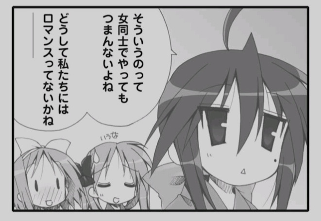 Такая культовая манга, и нигде нормальных сканов оригинальных чё-т не найти... Может, затарить ксерокс хороший и искать спонсоров, ибо на одного суммы весьма внушительные выходят... Или... Если кто-то хочет почитать Lucky Star в оригинале и знает, как BookLive!Reader'овские сканы доносить до общественности, ようこそ