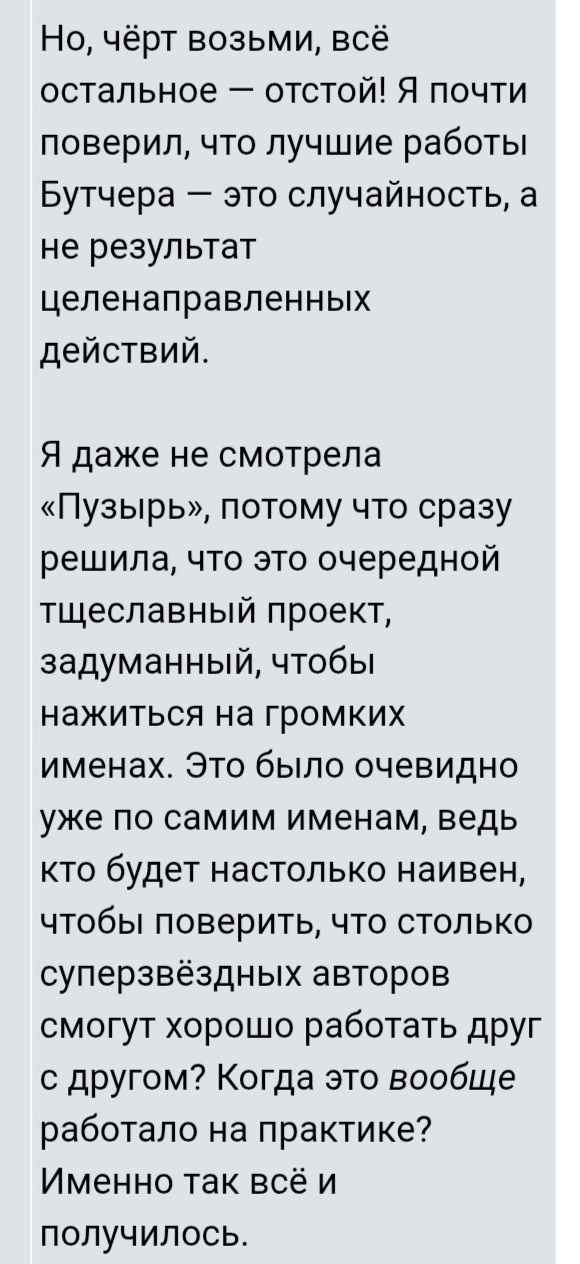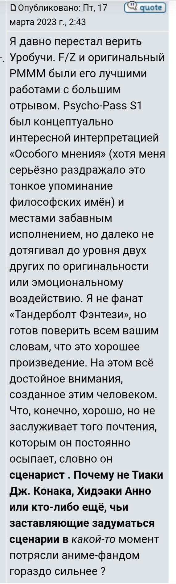 @darksidersonemoon@kost12000, он такой и есть)@yolo_V@vladshumi, мне кажется ты не со всем творчеством Геныча знаком, ибо он ворвался еще в начале нулевых и не переставая на протяжении 10+ лет выдавал годноту. Потом исписался конечно, но точно уж не "быстренько исчез"@vladshumi@yolo_V, я конкретно про аниме сегмент. Так то понятно что писал он уже давно сценарииТак что да, заслуженно бездарь.