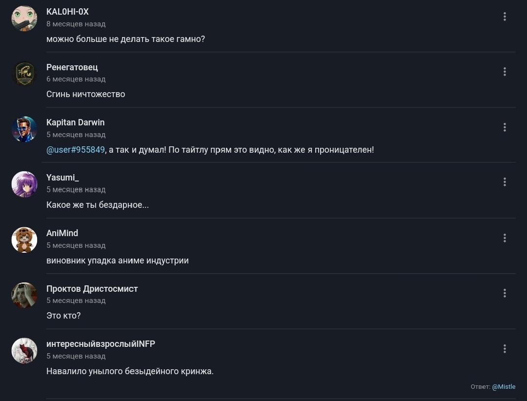 Очередной раз убеждаюсь, что такие лицемерные идиоты без собственного мнения никогда не исчезнут. Да и в общем то это не только проблема аниме, таких везде хватает. Просто тут на мой взгляд они гораздо чаще встречаются. Не хотелось конечно байтиться, но такие высеры сложно было не прокомментировать