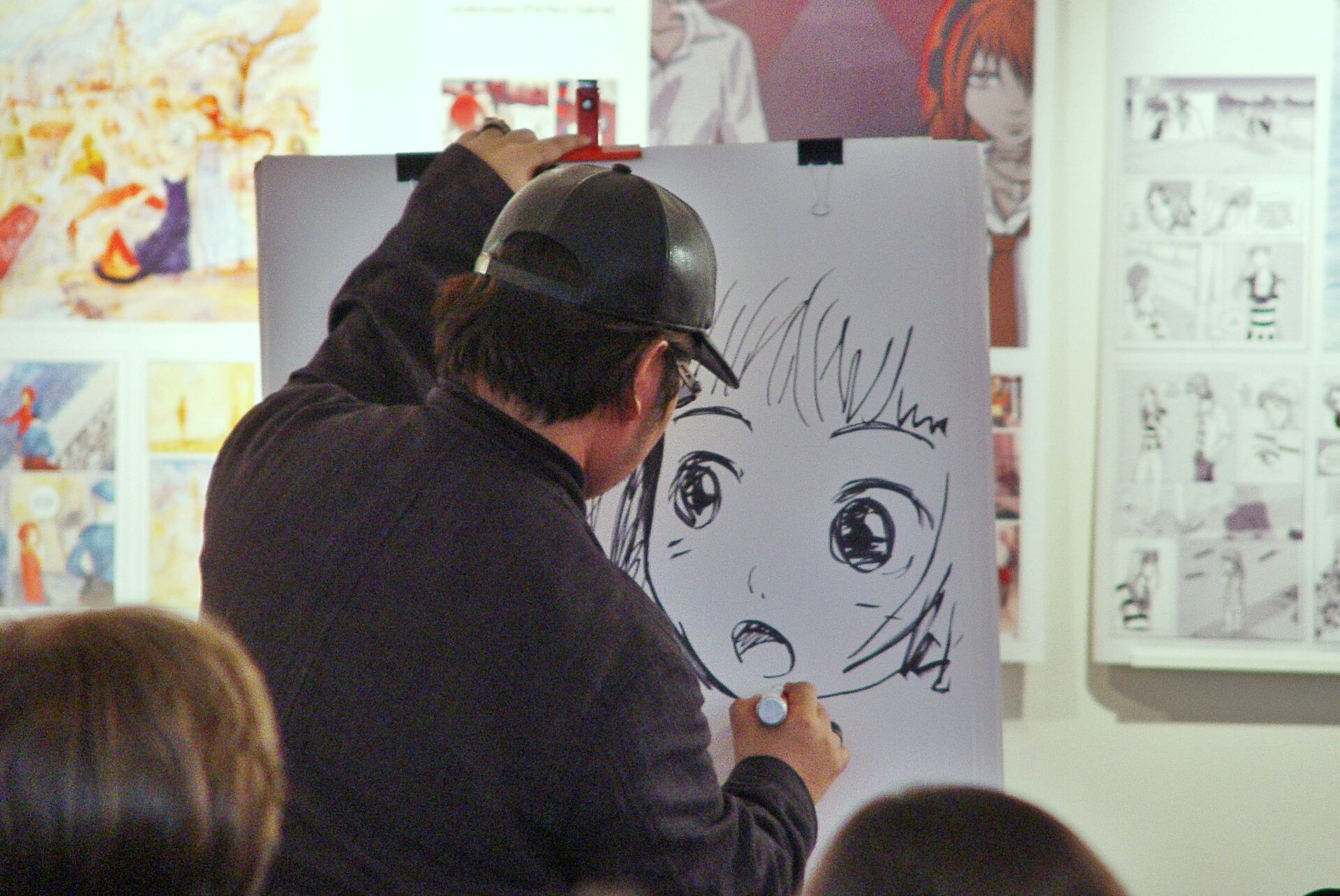 @Clear Foe@Lipton De-Black Tea, "Май 2007, иллюстратор Рэндзи Мурата @Murata_Range на фестивале «КомМиссия» в Москве. Фото Алекса Лапшина и Даши Абрамовой.""Мурата приезжал в составе небольшой делегации Wani Magazine, выступал два дня (переводчиком был Дм. Коваленин) и в ходе мастер-класса изобразил девочку, сражаясь с русскоязычным интерфейсом фотошопа."
