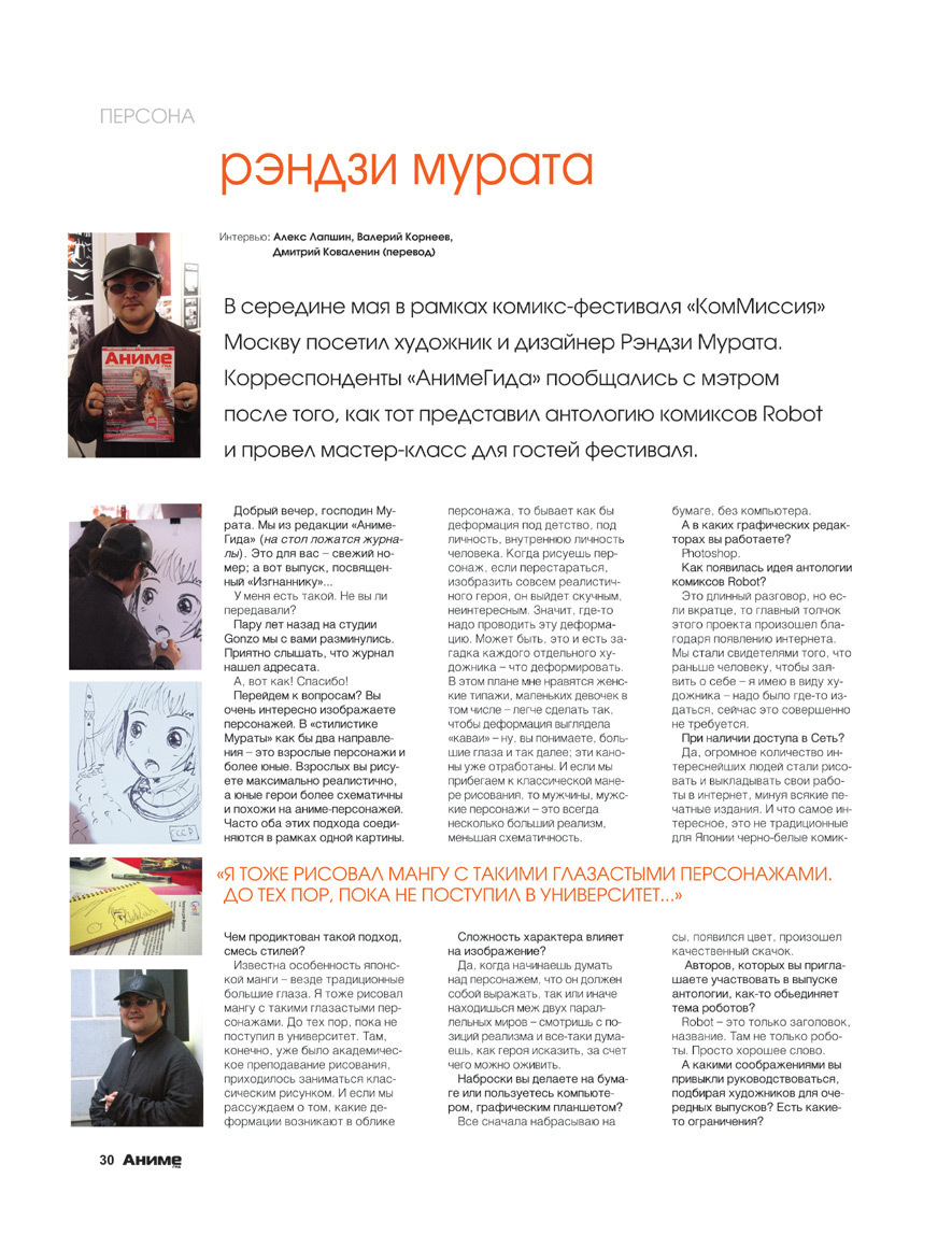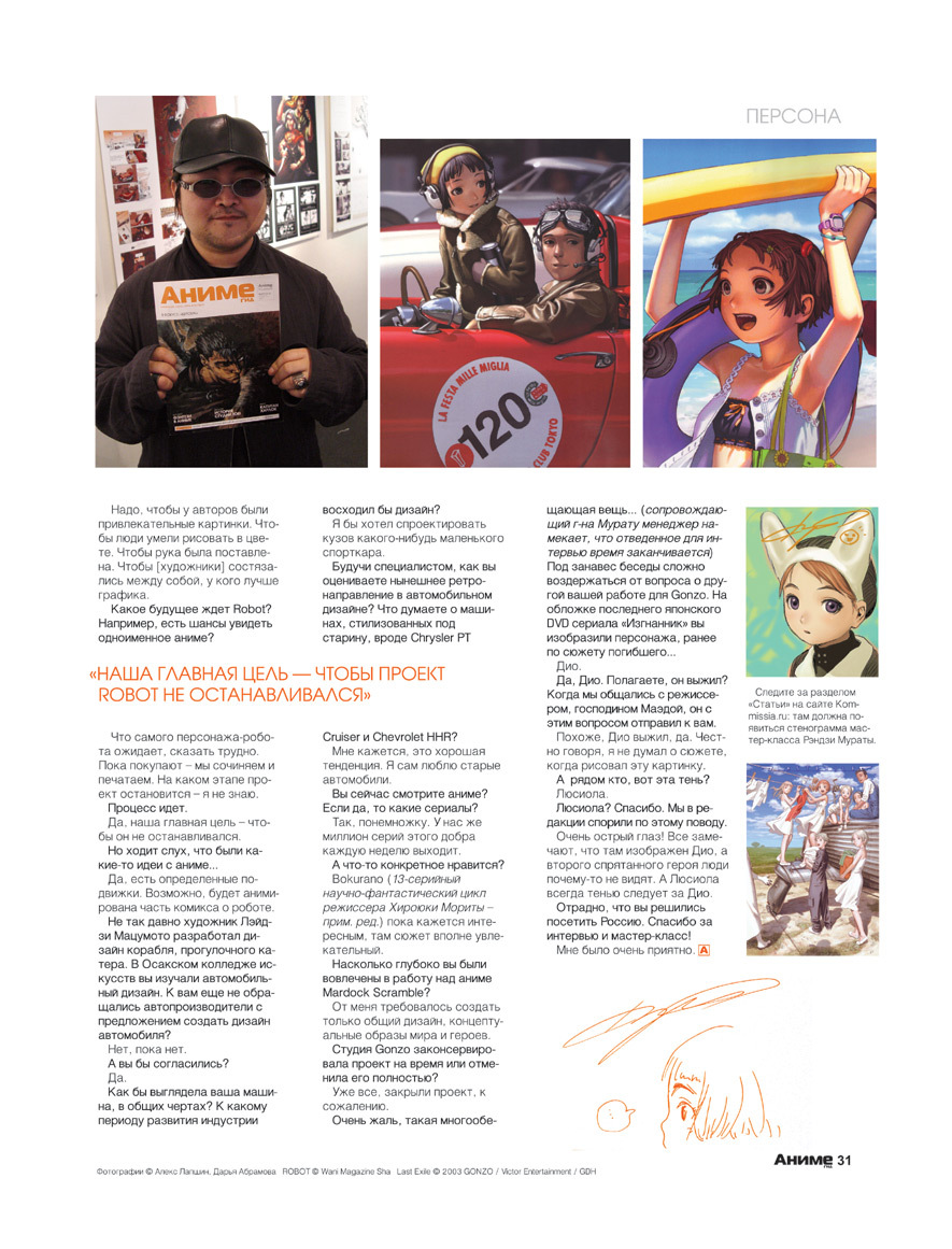 @Lipton De-Black Tea, "Май 2007, иллюстратор Рэндзи Мурата @Murata_Range на фестивале «КомМиссия» в Москве. Фото Алекса Лапшина и Даши Абрамовой." "Мурата приезжал в составе небольшой делегации Wani Magazine, выступал два дня (переводчиком был Дм. Коваленин) и в ходе мастер-класса изобразил девочку, сражаясь с русскоязычным интерфейсом фотошопа." На второй странице фото с аватарки: " Интервью в «АнимеГиде» (№22, июль 2007) по итогам визита. Рассказывает, в частности, что Дио в конце «Изгнанника» выжил. Вроде бы они тогда пытались договориться с кем-то из российских издателей о выпуске здесь комикс-антологии Robot, но дело не заладилось."