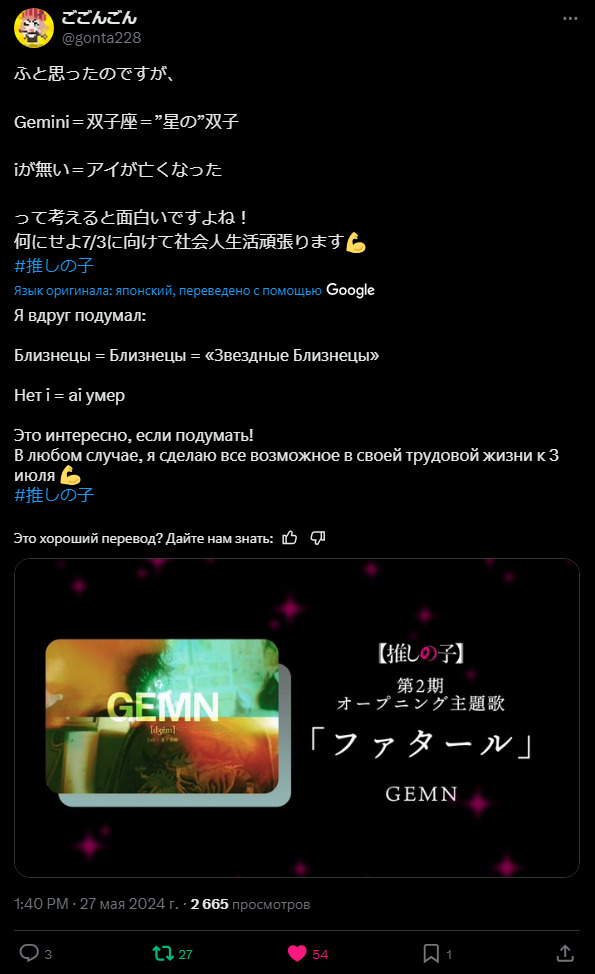 КомментарииFireworky28 мая 2024#(спойлеры к первому сезону ошиноко)Egortos29 июня 2024#Если кому интересно, то это дуэт, состоящий из Kento Nakajima и Tatsuya KitaniТацуя Китаниiwanttodiekaa 2 июля 2024#Жду полную версию песни. При всей спорности тайтла, над аудиовизуалом постарились.iwanttodiekaa 8 июля 2024#youtubeназадТвой комментарийссылкаанимемангаранобэперсонажчеловекOKВставка изображения:OKЦитирование пользователя:OK* Текст