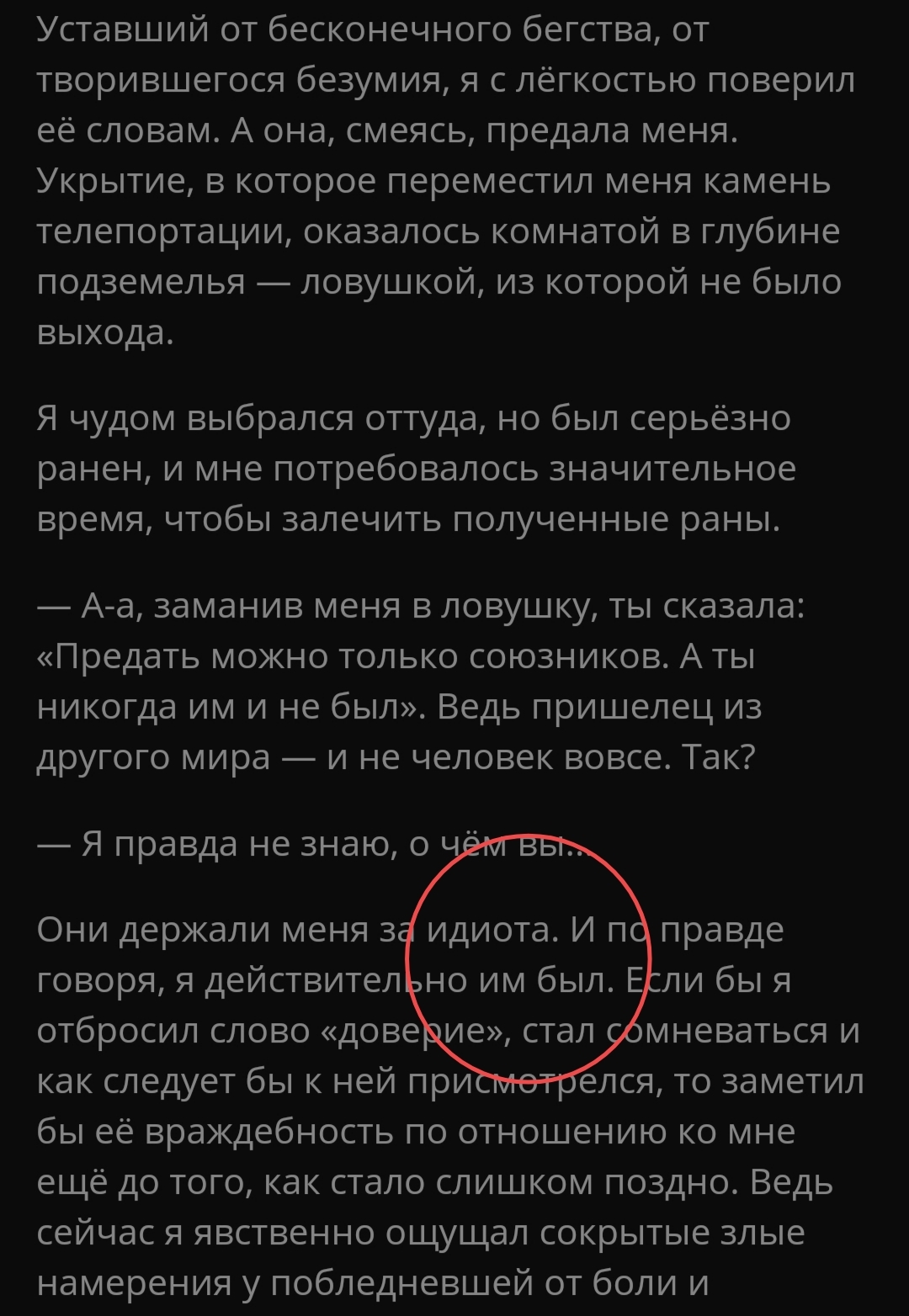 Все-таки странно, что автор не замечает грань, когда состояние безумия переходит в наигранные бредни. Тематика не свежа, но почему нет? — думал я, ага. По факту же ну такое откровенное дерьмо выливается на читателя. Настолько тошное чтиво. Видимо, автора его редактор освеживает и ядом заливает, вследствие чего тот в конвульсиях бьется, изрыгая этот мусор.