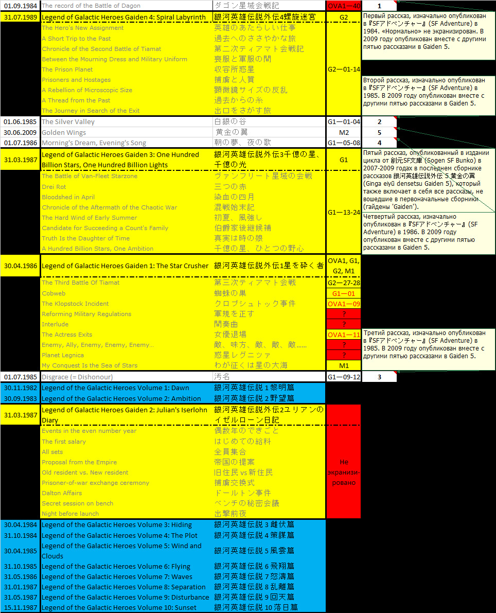 Желтым помечены гайдены, синим — главные книги, красным — что рассказ не экранизирован. Насчет девятой и одиннадцатой серий в OVA1 не уверен, но названия рассказов и серий одинаковые. Также похоже, что рассказ Cobweb из первого сборника экранизирован в первой серии первого гайдена, где они на морозную планету полетели — в рассказе такой планеты нет.