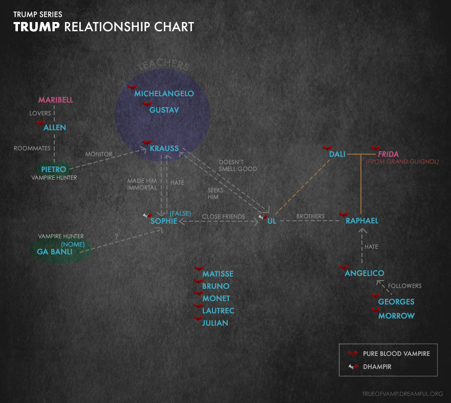 К слову, можете смело добавлять абсолютно всех персонажей из этого аниме в коллекцию (за исключением Джуласа, Катарины, Абрахама и Кита, так как о них пока что мало известно), потому что во вселенной "TRUMP", во-первых, все вампиры чистокровные, и, во-вторых, люди и вампиры не сосуществуют вместе (это может произойти только за редким исключением), т.е., например, в вампирской благородной семье нянька не может быть человеком. Дампиры же, особенно взрослые, являются крайне редким явлением, так как могут не дожить даже до подросткового возраста ввиду определённой особенности.