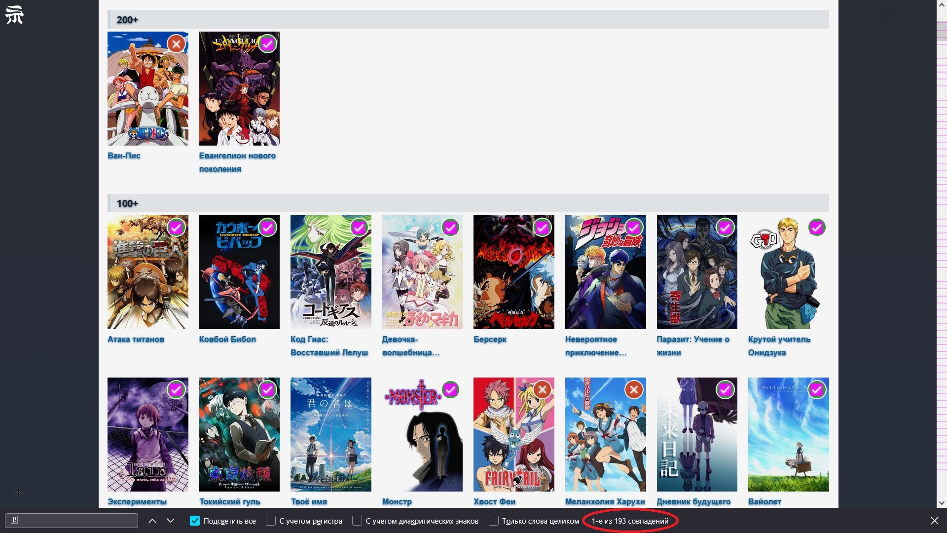 @gamereugene1,@Vasil_isk,@Vasil_isk@Mr.Zxnm, Steins;GateВрата Штейна (150)@Apc, сейчас "умельцы" еще больше своих недоинтерактивов наделают, по типу "ваши любимые аниме, где говорят главному герою "Сэмпай" ", и будет на шики десятки аниме с 200+ коллекций@Apc,@siverko19@Mr.Zxnm, к слову не хватает вот этого Seishun Buta Yarou Wa Bunny Girl Senpai No Yume Wo Minai 82 коллекции@gamereugene1, Да. Я хотел упомянуть и интерактивы, но про них уже так однозначно не скажешь, что они никак не отсылают к содержанию самого аниме.@gamereugene1,@Apc@Mr.Zxnm, после обновления стало 232 из 487 или 47,6%.@Apc@Vasil_isk, Так ему и не надо отображаться. Надо только, чтоб его можно было скопировать и поиск по символам его распознавал.@Vasil_isk@Vasil_isk, после обновления стало 141 из 487 или 28,93%.@Apc, я вставил, но поиск показывает его только в том месте, откуда я его скопировал.@Apc@Vasil_isk, А, ну это типично для ХромаВроде все программисты в первую очередь под него сайты затачивают, но всё равно в нём постоянно что-то не работает