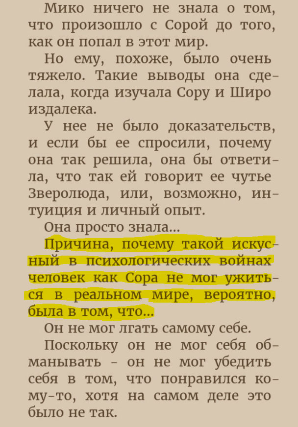 Вот и наш главный герой Сора был таким же до тех пор, пока не встретился с маленькой девочкой по имени Сиро. Закрывшись от окружающего мира, они оба образовали дуэт «Пустых» и развили свои навыки игр до таких высот, что каждое их столкновение с противником гарантировано заканчивалось их победой. О них ходили легенды, как о тех, кто за всю историю геймдева не проиграли ни одну игру. Тем не менее, в реальном мире они были никем иным, как просто несчастными людьми, коим в реальном мире делать было нечего.