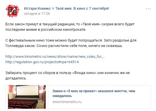 @Mokkoriman@Silicium, ееее Курск«Твоё имя» скорее всего будет последним аниме в российском кинопрокате. Из за закона об оплате 5 миллионов за прокат.