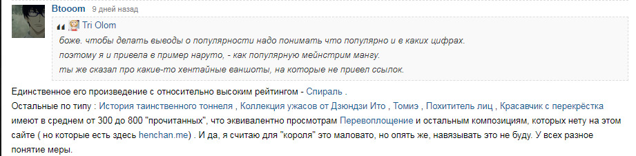 @Btooom@pumpkin_juice@Btooom, а ты ожидал, что тут же здесь выгрузится самосвал с его фанатами? Ты, товарищ, очень перегибаешь палку занудства, раз настолько придираешься к слову. Не всё в жизни, как по книжке. Прям как на экзамене, чесслово.@Btooom@idontknower@Btooom, /clubs/1488-fan-klub-tvorchestva-dzyundzi-itoТо есть, то что у мангаки, есть свой фанклуб на шикимори, он находится у большего количества людей в избранном, чем автор хайпового гуля, тебя не смущает.
