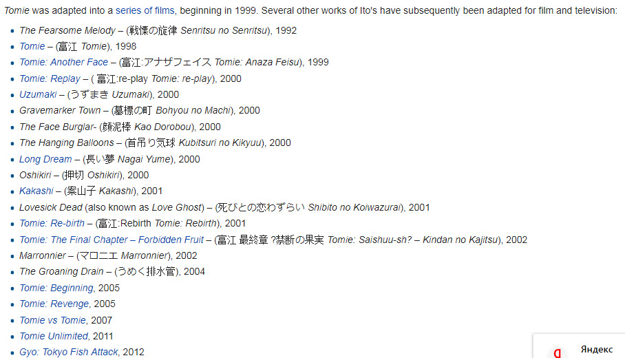 @idontknower@schaffen, Лучше почитай Спираль.@Aniki@fatality_pro, велика вероятность того, что к изданию планируется вся эта трилогия:Tomie, Uzumaki, Gyo: Ugomeku Bukimi