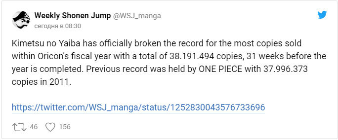 Продажи Kimetsu no Yaiba (Клинок, рассекающий демонов) за этот год уже составляют 38 миллионов 191 тысяча экземпляров. Рекорд One Piece (Ван Пис) в 37 миллионов 996 тысяч экземпляров держался с 2011 года.
