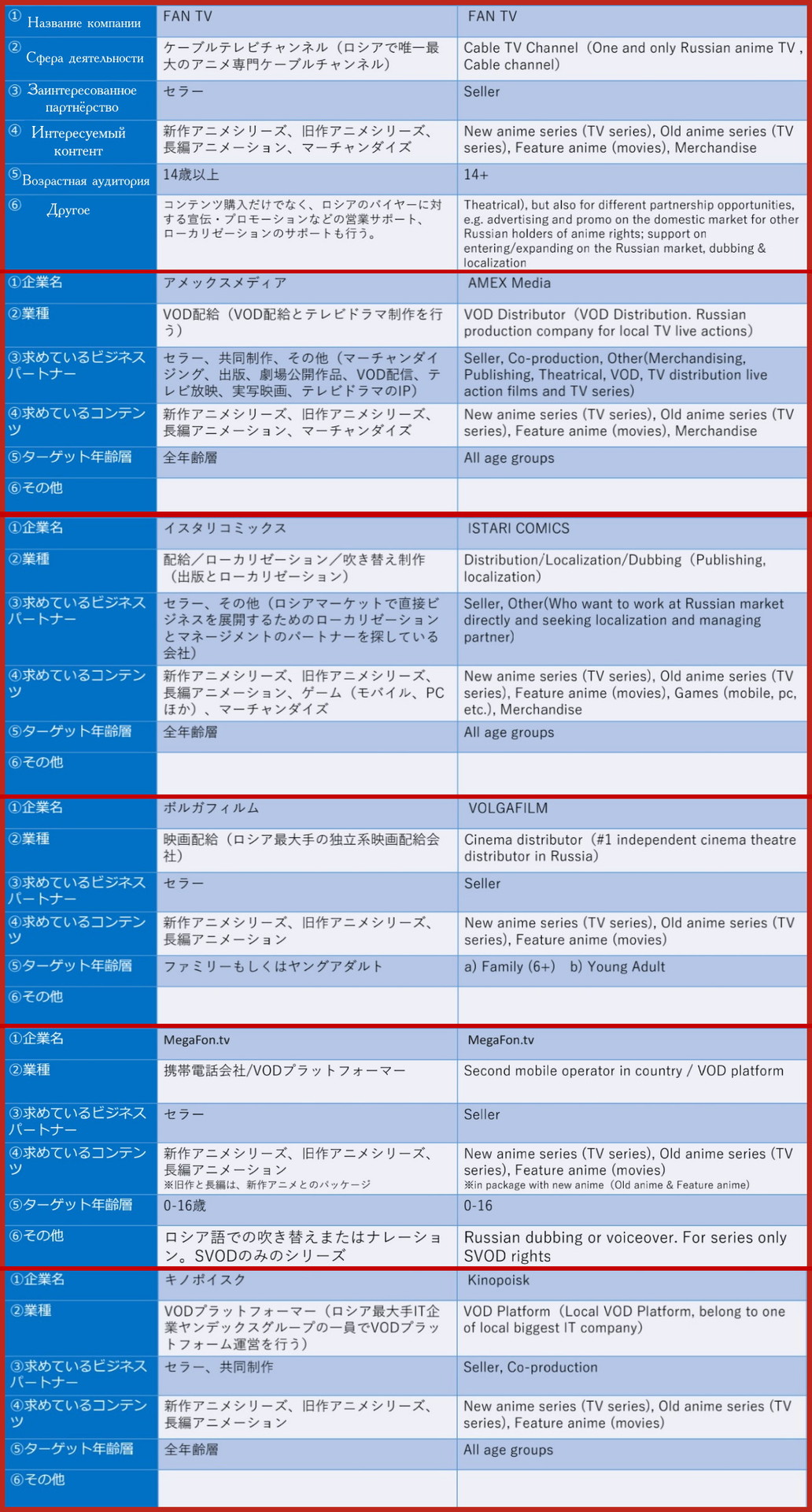 - AMEX Media — новые и старые аниме сериалы, полнометражные аниме, мерчендайз. Кроме того, в перечне указано совместное производство, а также поиск партнёров в области мерчендайзинга, игрового кино, дорам и издательства.