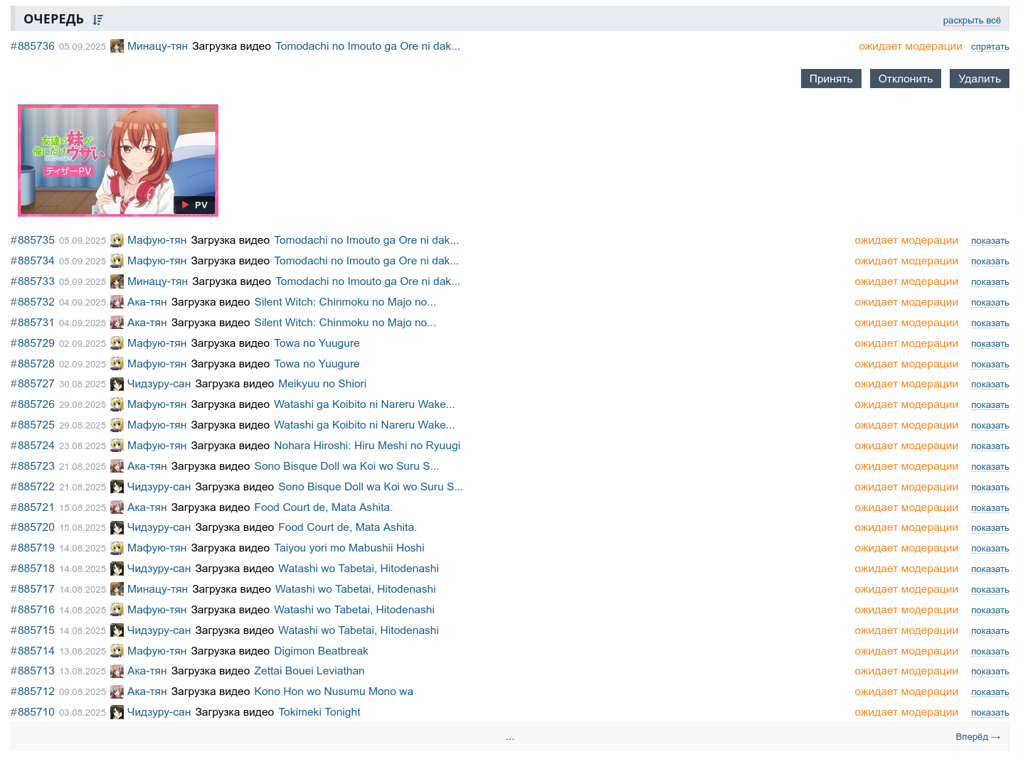 @morr предполагал, что кто-то из вахтеров или даже он сам должен модерировать эти видео с МАЛа, на предмет чего-то (?) вопрос нахуя впринципе модерировать видео с МАЛа предлагаю оставить открытымВ общем если видео нет на сайте - то это именно по этой причине, щас решаем, что с этим делать, потому что кнопки автоапрува всех видео