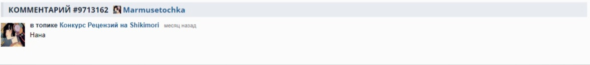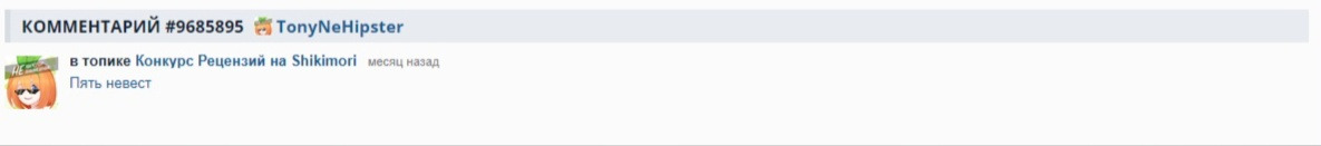 @Gyroscope19@rainfog, согласен. Так мем ещё в том, что модератор рецензий пользуется ещё дополнительной кучей правил. И когда у него спрашиваешь, а где это в правилах написания рецензий, ответ такой: правила неполные, их следует редактировать. Дошло дело до того, что в правила следует добавить определение рецензии. А это уже реально сочинение по чеклисту, а не творчество.@rainfog@Gyroscope19, а где нибудь в рунете нормальные рецензии на аниме вообще есть?@Gyroscope19@rainfog, Во-первых, всё зависит что подразумевать под нормальными. С помощью рецензии можно выбирать аниме для просмотра, можно сравнивать свои впечатления с впечатлениями автора, можно посмотреть на произведение новым взглядом. Во-вторых мне кажется на любом ресурсе можно найти хорошую рецензию. Даже на шикимори. Мне, например, нравятся рецензии Idzumi. Они без спойлеров, и после их прочтения остаётся яркое впечатление, иногда даже схожее с просмотром аниме.Ещё есть рецензии на аниме на кинопоиске. Они не очень большие, без спойлеров, в них авторы не выделяют нудные неуравновешенные разделы рисовку и музыку. Вполне можно почитать.