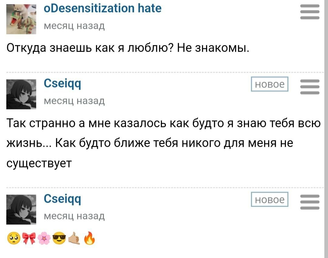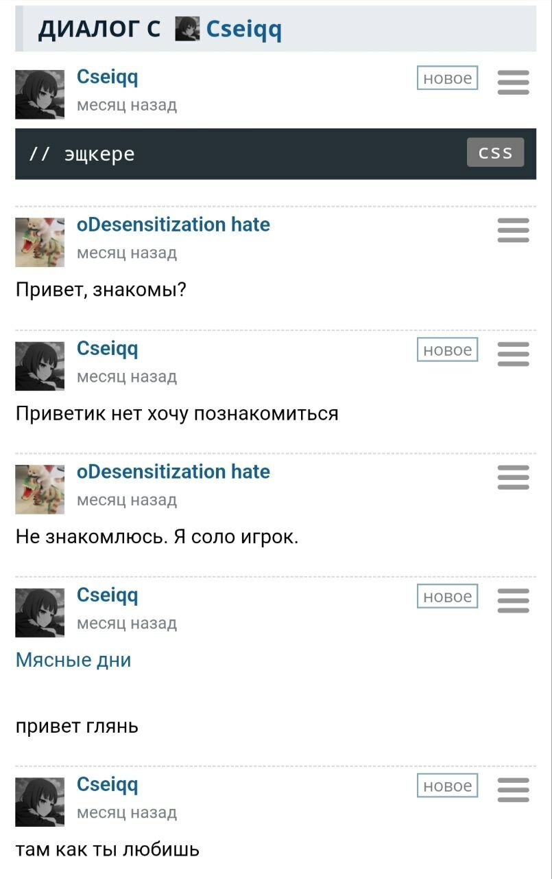 oDesensitization hate: Я начал осматривать её профиль и неожиданно обнаружил, что она также любила те аниме, которые были мне близки, как «Технолайз» и «Эксперименты Лэйн». Это дало мне надежду и мотивацию продолжать общение. Мне захотелось узнать Cseiqq поближе, но удалять её из ЧС и писать самому было страшно и неловко. По счастливому стечению обстоятельств, у нас на Шикимори были общие друзья (известные в Шикимори-кругах как akulenok9999, Степан64 и Heroine Slavic Doll), через которых я выяснил, что Cseiqq — завсегдатай одного дискорд-сервера, на котором обитает высший эшелон Шикимори-комьюнити. И я зашёл на этот сервер. Впервые в жизни создал аккаунт в дискорде, ибо раньше никогда в нём не сидел — боялся общаться с людьми голосом.