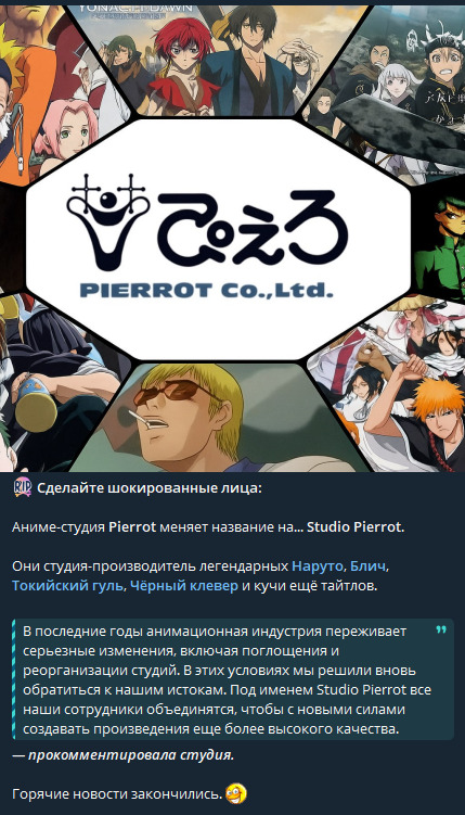 В пятницу, 1 августа, анимационная студия Pierrot объявила об изменении своего названия с «Pierrot Co., Ltd.» на «Studio Pierrot Co., Ltd.»