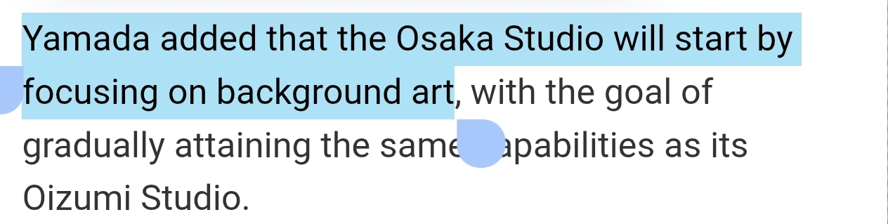 Ямада добавил, что студия в Осаке сначала сосредоточится на фоновй рисовке, стремясь постепенно достичь тех же возможностей, что и студия Oizumi.