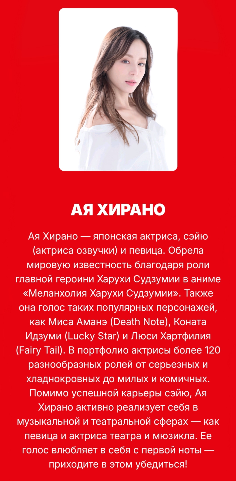 С 18 октября в Москве пройдёт выставка Hinode Japan 2025, посвящённая японской культуре. Перед публикой выступят приглашённые гости из Японии, и одна из них — это актриса озвучки Ая Хирано, известная по таким ролям, как Харухи Судзумия из «Меланхолии Харухи Судзумии», Коната Изуми из «Счастливой звезды», Миса Аманэ из «Тетради смерти», Люси Хартфилия из «Хвоста Феи» и множество других. Во время мероприятия девушка выступит с концертом, а после состоится автограф-сессия для фанатов.