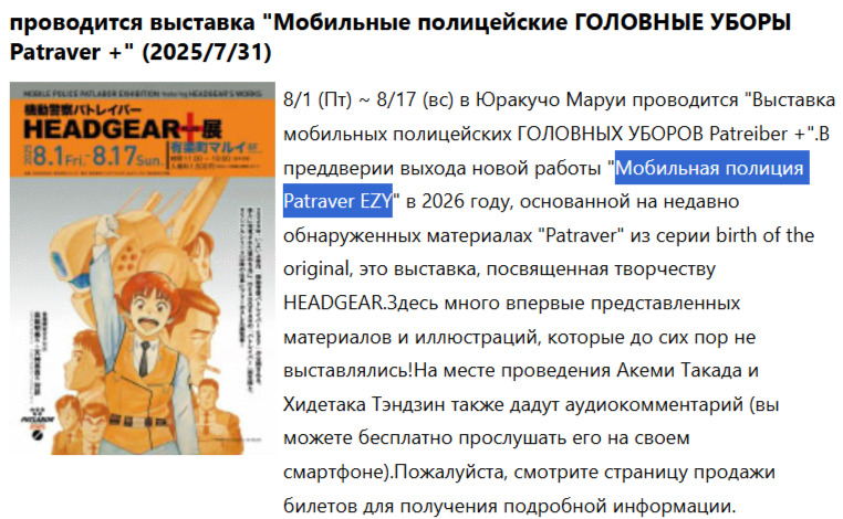 В ходе обсуждения, состоявшегося в субботу, 13 декабря, на Международном кинофестивале в Айти-Нагое в рамках показа «Kidou Keisatsu PatlaborПолиция будущего», сотрудники, работающие над «Kidou Keisatsu Patlabor: EZYПолиция будущего: EZY», который выйдет в следующем году, подтвердили дополнительные подробности о новом аниме.