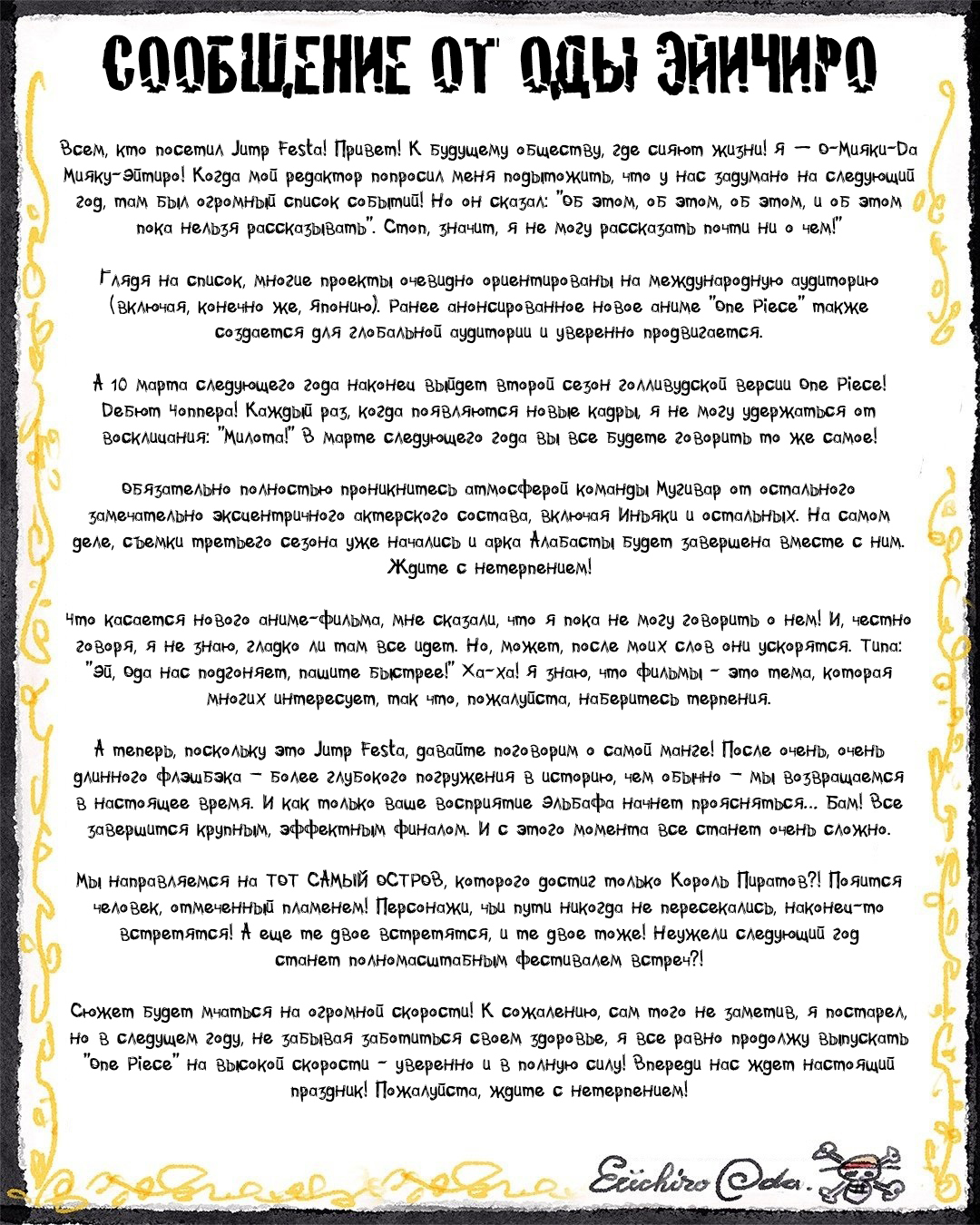 Кстати сегодня ещё было сообщение от Оды, в котором он упомянул, что производится новый аниме-фильм, и появление отмеченного пламенем в манге