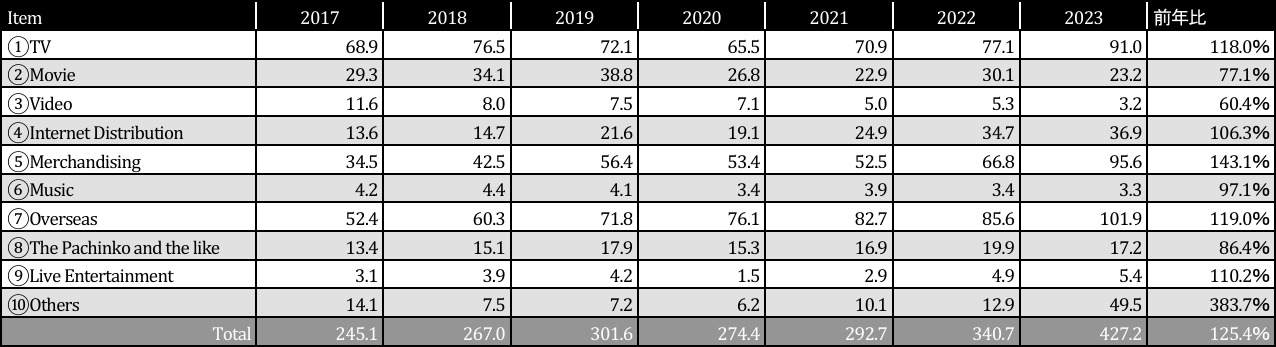 Проблемы зафиксированы в сегменте связанном с аниме и фильмами, который понес операционные убытки в размере 904 млн иен (год назад здесь была прибыль в 4,7 млрд иен). Чистые продажи составили 31,6 млрд иен (снижение на 16,6%). Главная причина отсутствие сиквелов к известным аниме. Кроме того, снизились доходы от проката фильмов в кинотеатрах.