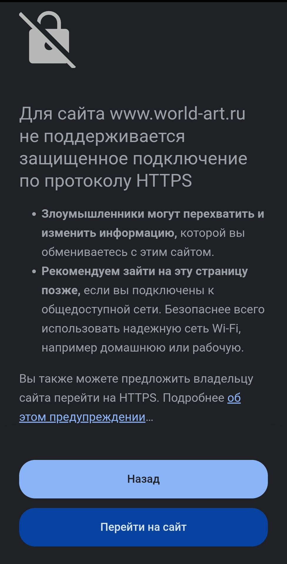 @Sprint 2, @siverko19, проблема сертификации возможно из-за ркн где якобы устарели сертификаты * У меня так выходило Но если нажать снизу то показывает сайт.
