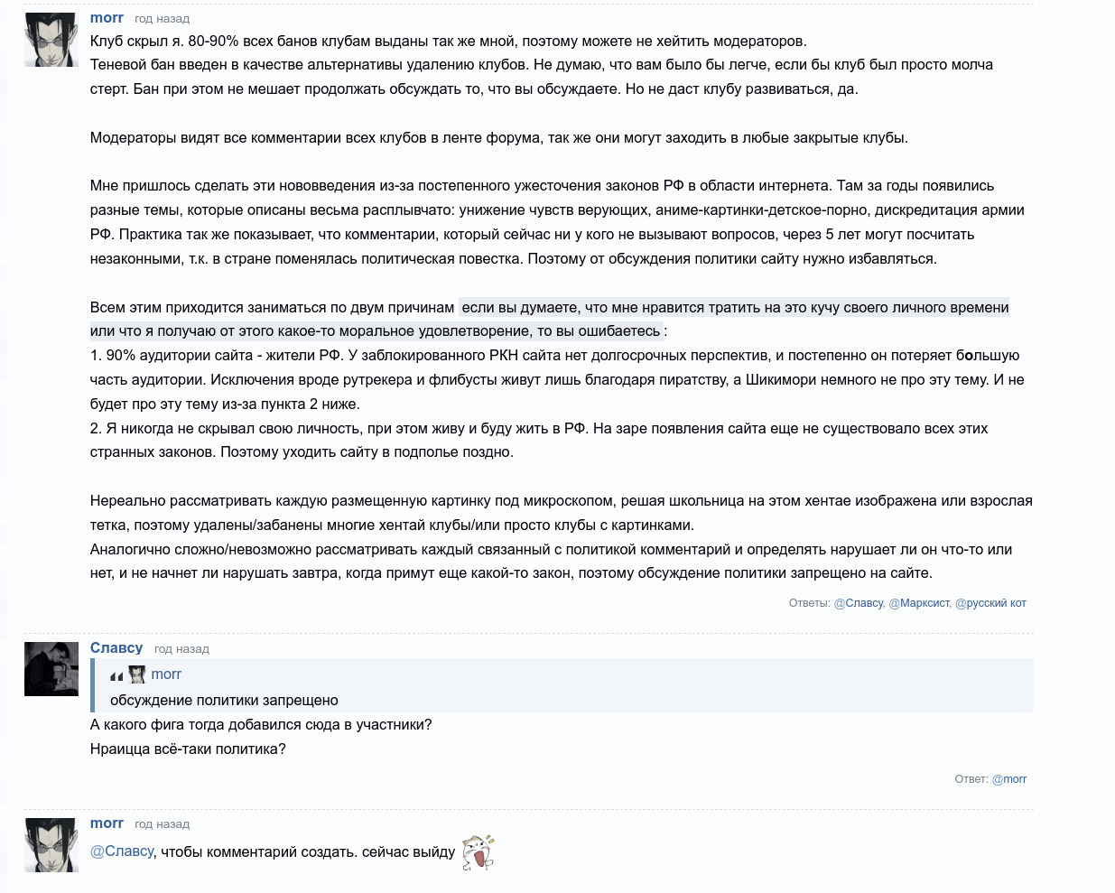 Я повторюсь, но "замыливать мозг" пользователям - сущий моветон со стороны супермодератора, учитывая какие громкие заявления он делал, вступив на должность модератора. Обсуждать с Гареком подобное можно долго и безрезультативно, видется мне. Объяснять, что такое хорошо, что такое плохо Не крохе - трата времени. Я надеялась, что на Шики появится хоть один справедливый, честный и открытый модератор. Вот досада)