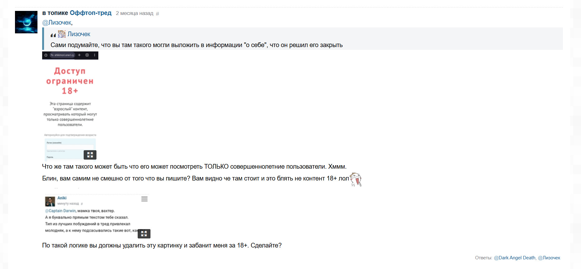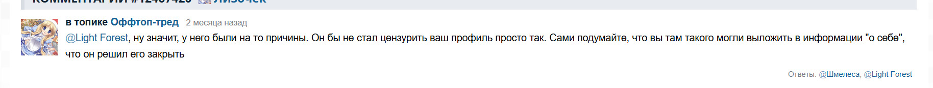 . Кто бы сомневалсяПосле арки терпение, я заебался и вчера ЕЩЁ РАЗ спросил лизочка о разблокировке. У нас состоялся небольшой диалог, к концу которого я охуел