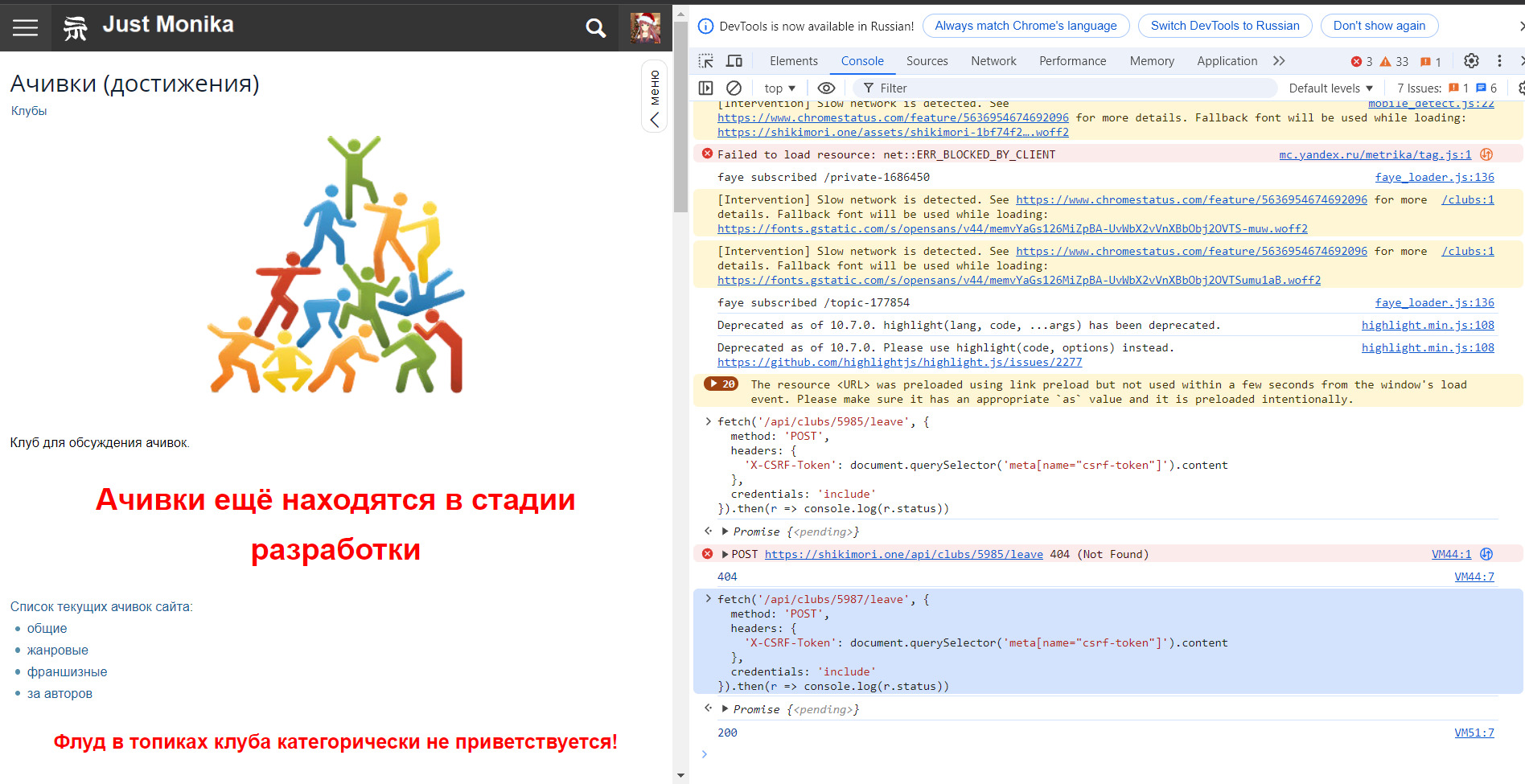 }).then(r => console.log(r.status))Полный вывод в консоль, тут на примере клуба ачивок, но сути не меняет, но вывод вам подождать придется, ждите "200" в консоль