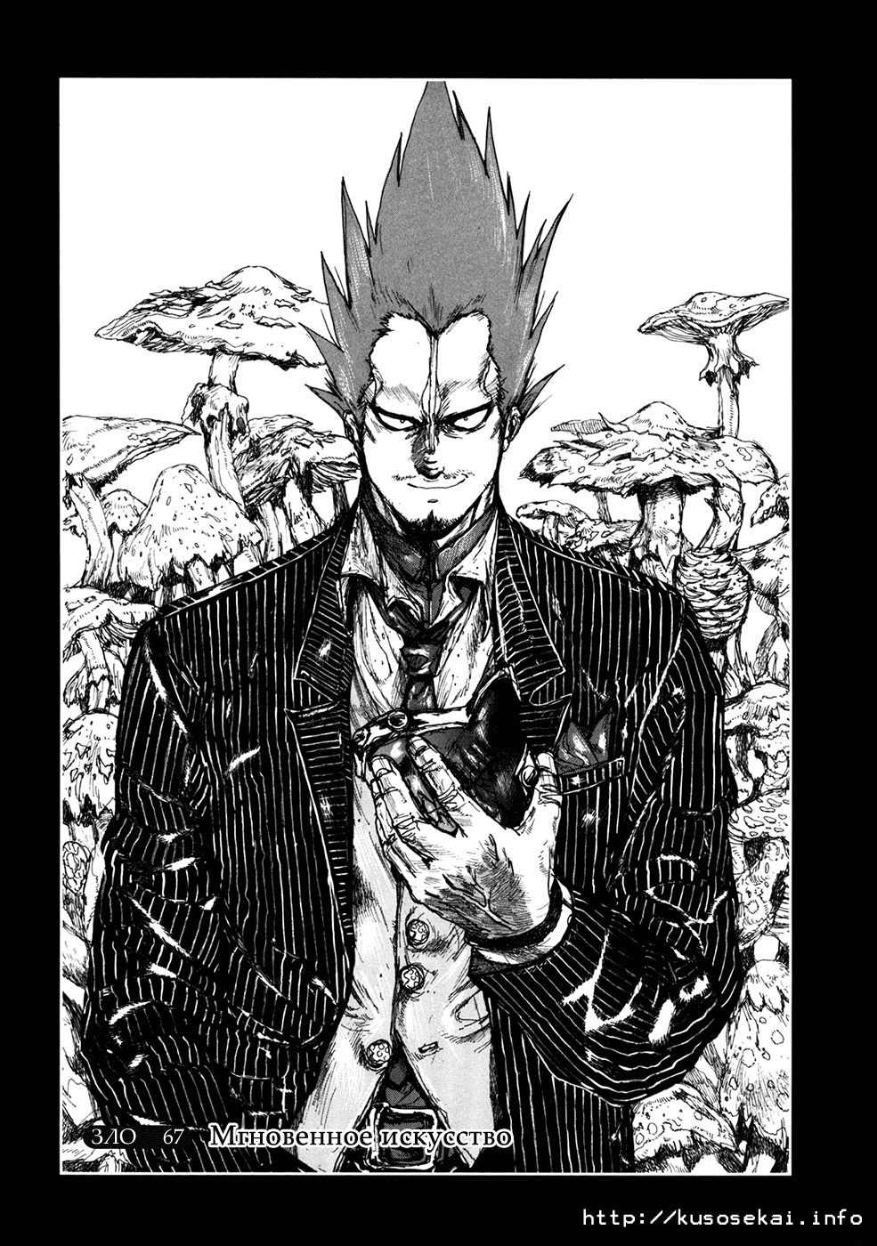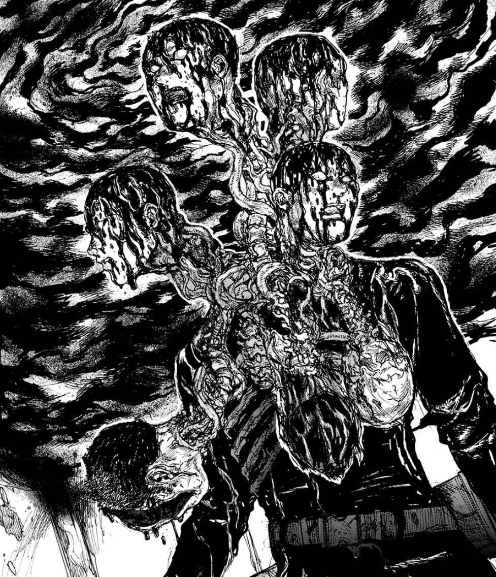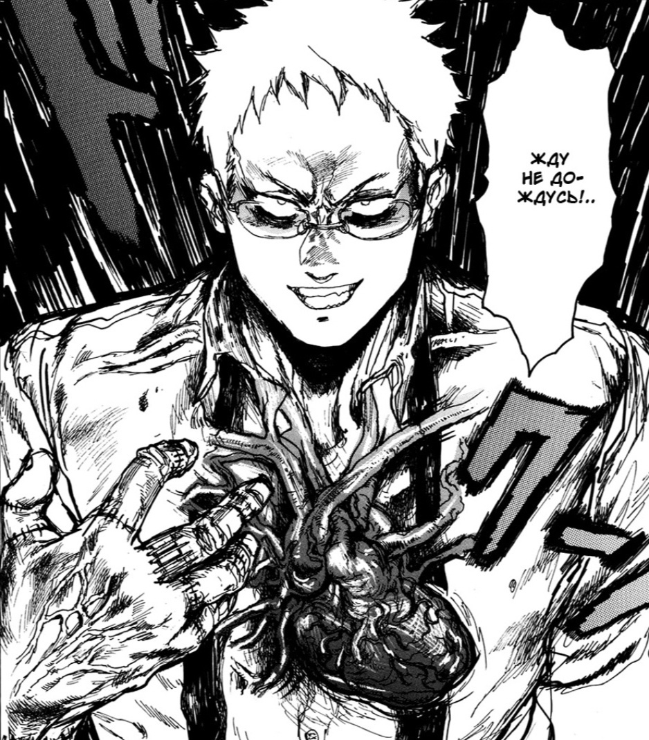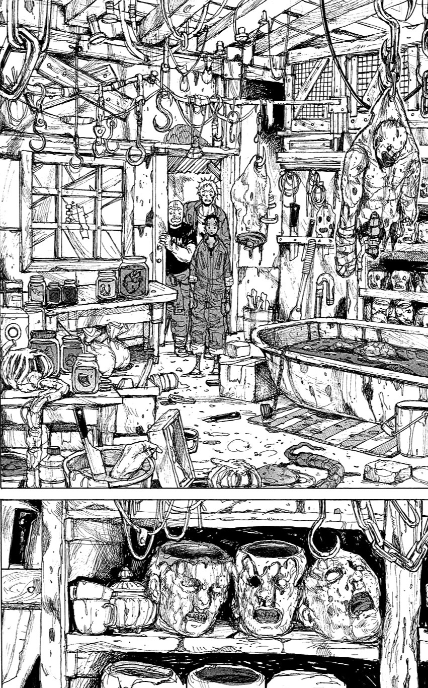 Насчёт рисовки, тут как вы видите она тут "грязная" и не очень приятная на первый взгляд, напоминает своей грязной рисовкой манги «Блейм!» и «Человек-бензопила». Она поначалу может показаться где-то на 6 из 10, однако эта рисовка очень сильно играет на атмосферу этой манги. Вкупе с событиями и рисовкой, ты сам начинаешь себя чувствовать грязным, как будто сам в этой "Дыре" живешь. Огромный совет, лучше читайте мангу осенью, рядом с хэллуином, чтобы максимально сильно прочувствовать погружение в этот тайтл. Вот для этого рисовка просто 10 из 10 подходит. Поэтому если брать среднее, то можно 8 поставить) Ну просто посмотрите на вот эти крутые кадры ужасов: