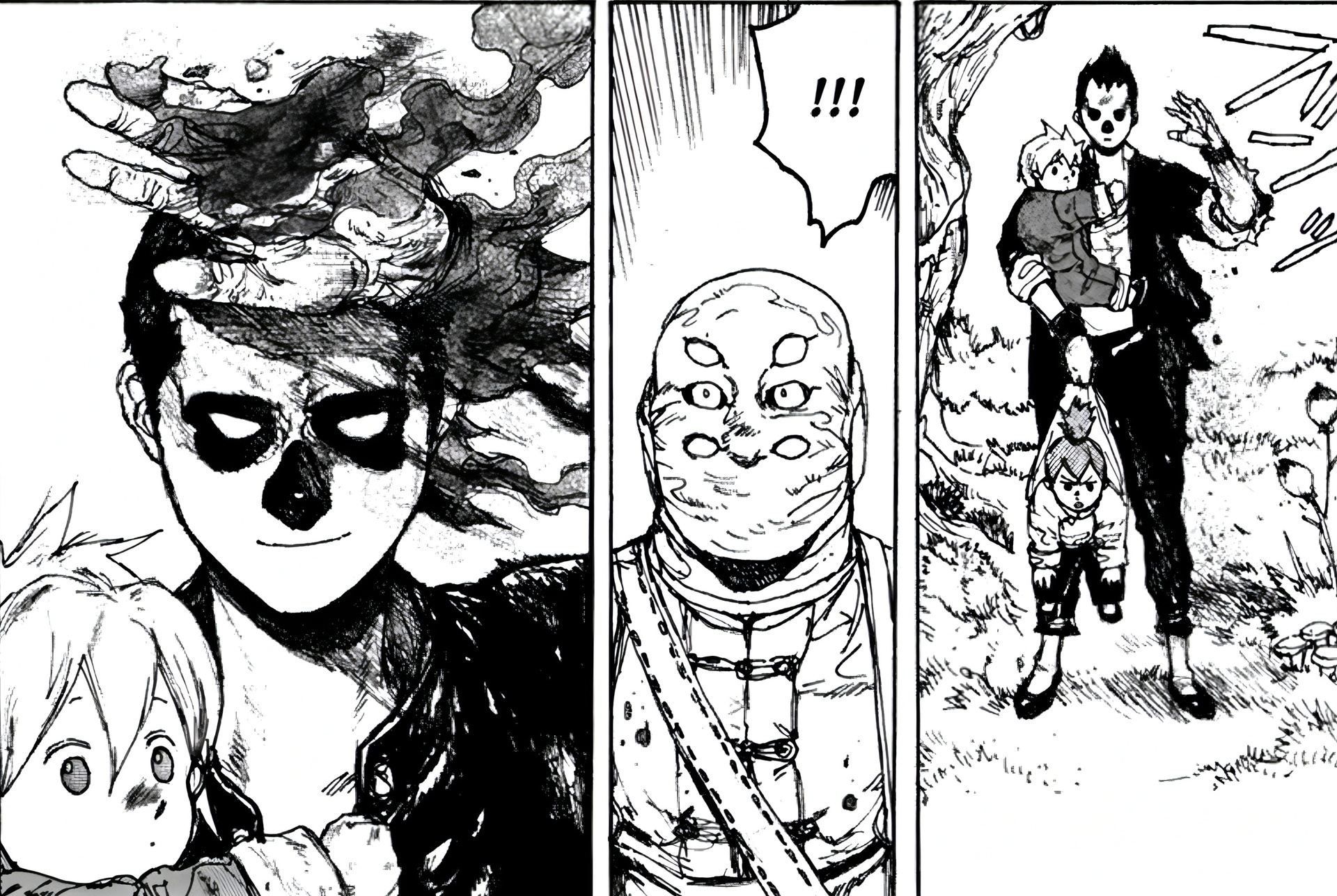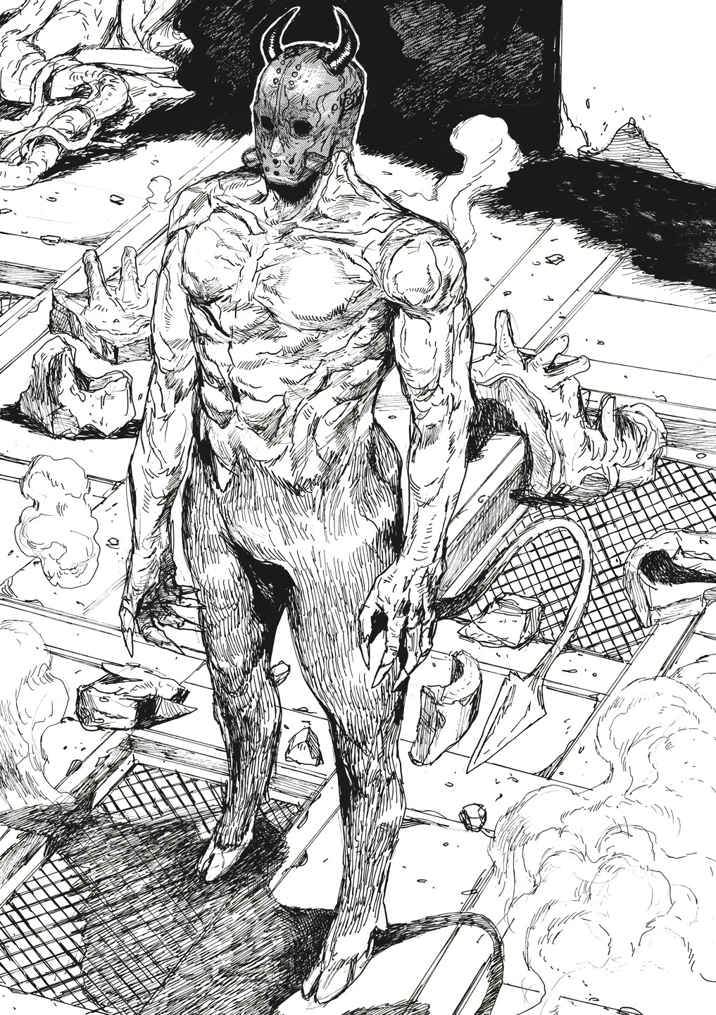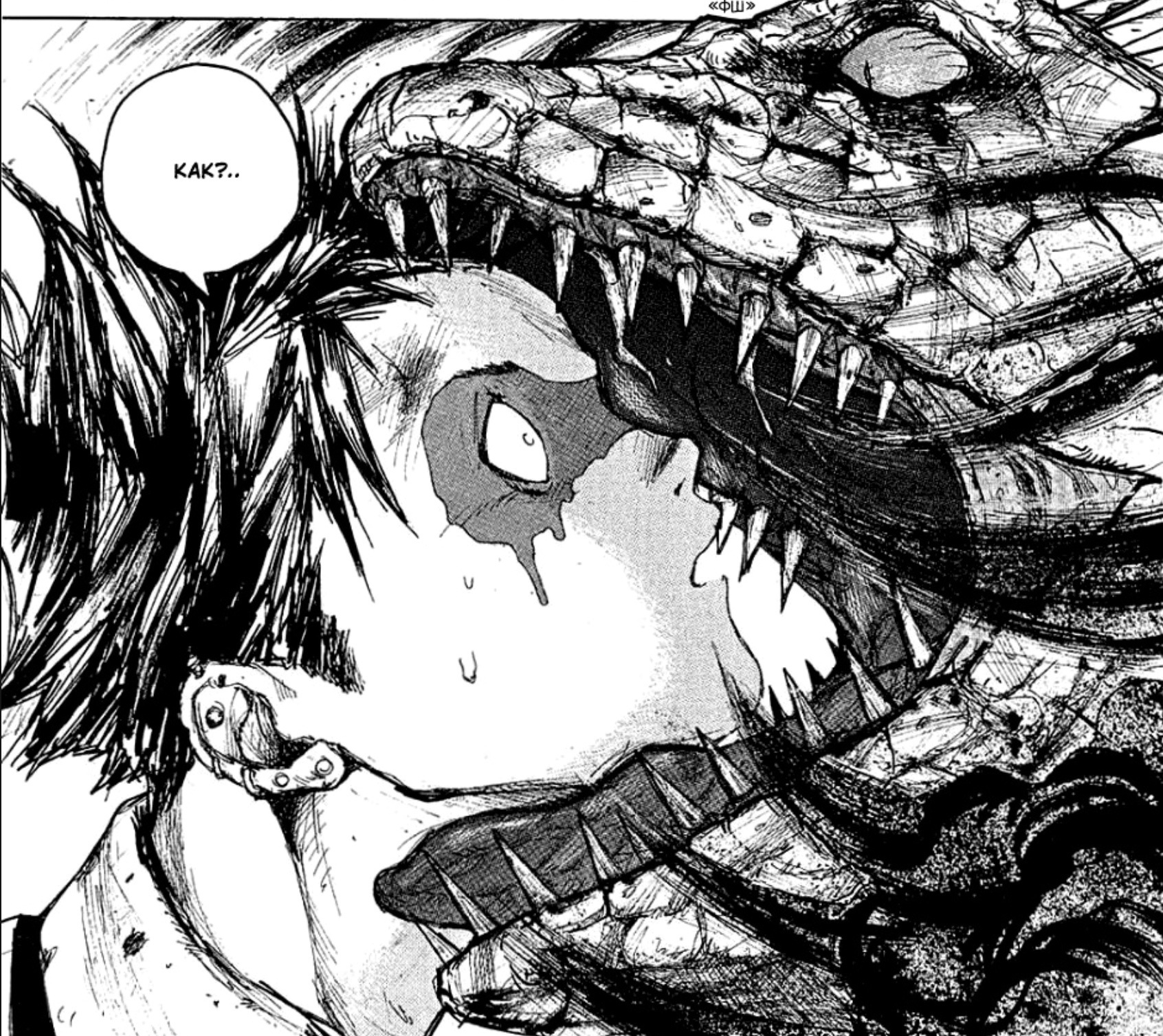 Насчёт рисовки, тут как вы видите она тут "грязная" и не очень приятная на первый взгляд, напоминает своей грязной рисовкой манги «Блейм!» и «Человек-бензопила». Она поначалу может показаться где-то на 6 из 10, однако эта рисовка очень сильно играет на атмосферу этой манги. Вкупе с событиями и рисовкой, ты сам начинаешь себя чувствовать грязным, как будто сам в этой "Дыре" живешь. Огромный совет, лучше читайте мангу осенью, рядом с хэллуином, чтобы максимально сильно прочувствовать погружение в этот тайтл. Вот для этого рисовка просто 10 из 10 подходит. Поэтому если брать среднее, то можно 8 поставить) Ну просто посмотрите на вот эти крутые кадры ужасов: