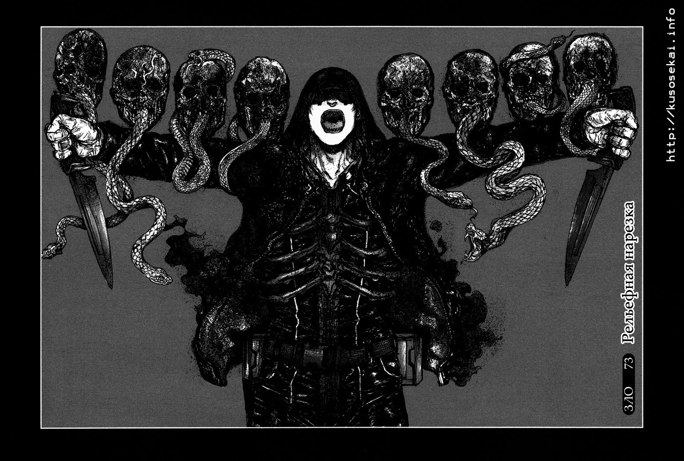 В заключение скажу, что у автора Кю Хаясиды, своебразный уникальный стиль манги, который дает новые ощущения при прочтении. Ни рисовкой, ни сюжетом вы столь похожее с трудом найдёте. Манга не очень большая, но и не маленькая, 167 глав, не считая экстры. Однако она законченная! Что является огромным плюсом! Не представляю тех, кто читал это в онгоинге, уж очень тут запутанный сюжет. Так что я настоятельно рекомендую как-нибудь осенью вечерами прочесть эту крутую и кровавую мангу для пущей атмосферы! Ощущения будут незабываемые!