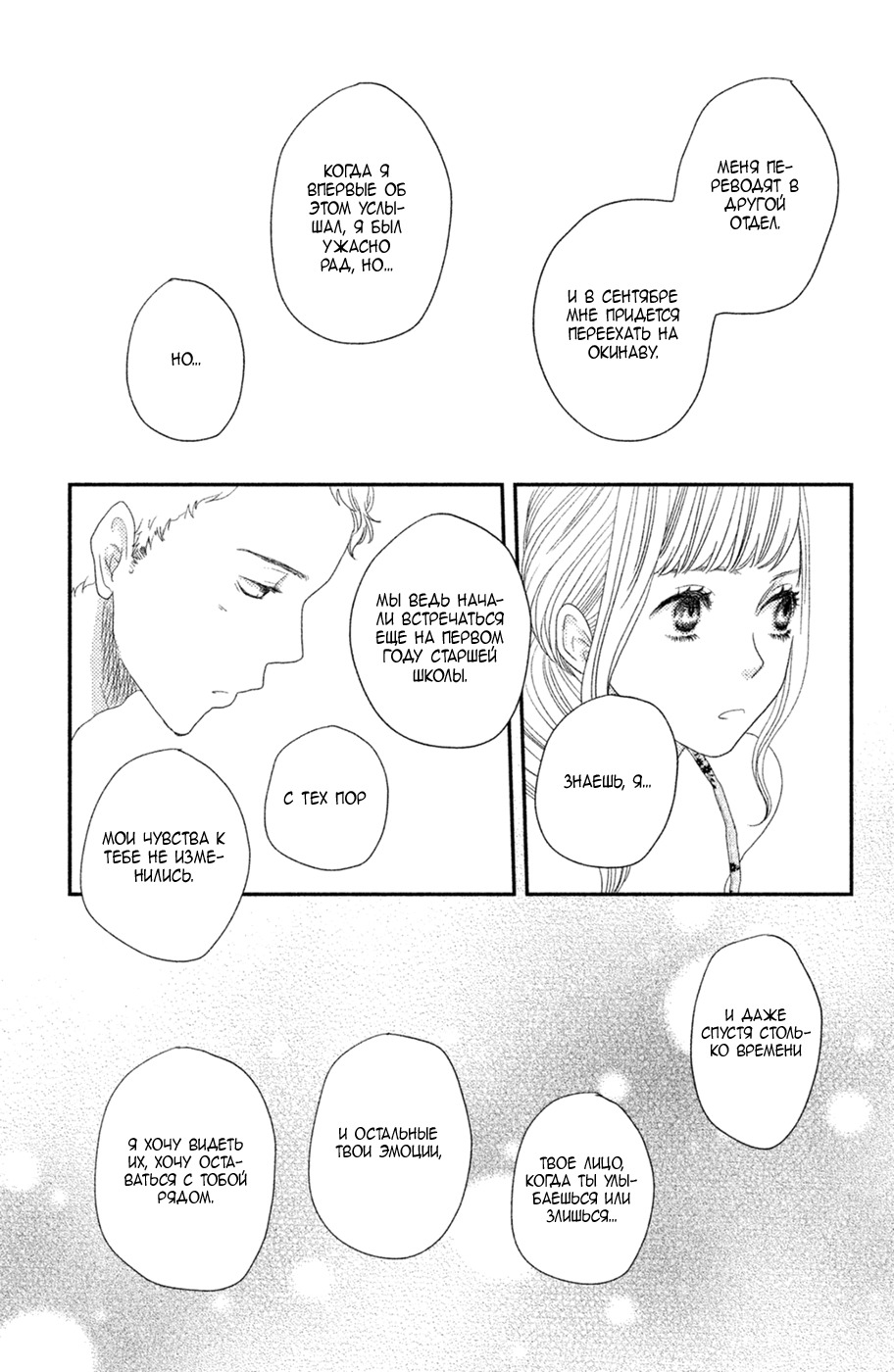 "Скажи я люблю тебя" идеальный пример скатившейся работы. Про одинаковость героев написано в отзыве выше (четырехлетней давности, однако, тогда все даже не так плохо было). А вот, для сравнения, рандомная страница из первых глав и из последних. Очень сильно заметно, как пропала насыщенность фреймами и репликами. Просто размазывание каких-то очевидностей на фоне личной жизни героев. Все. С каждым годом понижаю оценку этой манге, думаю, остановлюсь на 6/10, за то, что когда-то она меня не оставила равнодушной и заставила читать новые главы много лет.