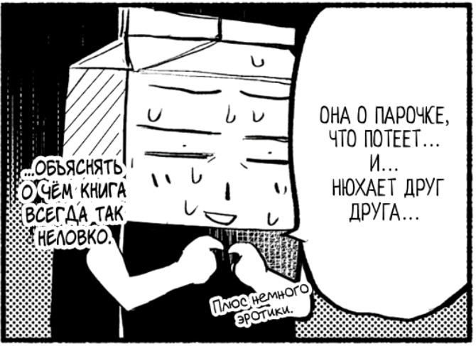 Тут нет драмы, тут нет подростков, тут нет японских пизΔостраданий - и это хорошо. За каждым шагом в их жизни тебе приятно наблюдать, ведь герои развивают свои отношения медленно, но уверенно. Как только начинаешь думать, к примеру, когда покажут родителей Asako YaeshimaАсако Яэсима, как тут же в следующей главе автор это воплощает. И так всегда. Практически идеальный ритм, как и количество глав. Больше - уже наскучит, меньше - придется ужимать, спидраня отношения. Наши главные герои не идеалы, они не вышли из журнала мод, они просто люди со своими недостатками и слабостями и сильными сторонами. Поэтому само собой во время взаимодействия они влияют друг на друга, становясь лучше как личности, становясь общим единым целым. Им приходится сталкиваться с жизненными сложностями: сомнение в себе, ревность, совместное проживание, недопонимание, встреча с родителями, призраки прошлого и так далее. На первый взгляд, это всё мелочи, однако из них и состоят отношения и, в общем, наша жизнь. Автор демонстрирует и раскрывает их, показывая возможный метод решения, не раздувая всё из мухи в слона. Короче, это очень приятная офисная романтика, вышедшая за пределы офиса. Накал страстей не ждите, тут всё умиротворенно, а взаимопонимание идёт в первых рядах. Единственная преграда, которая будет стоять у вас на пути - это фетиш на нюх, зачастую приводящая к частым “паркетным” актам. По сути, благодаря своему прекрасному нюху Koutarou NatoriКотаро Натори буквально унюхал себе супругу. Мне лично это не мешало, воспринимал как “перчинку”, отличительную фишку произведения.