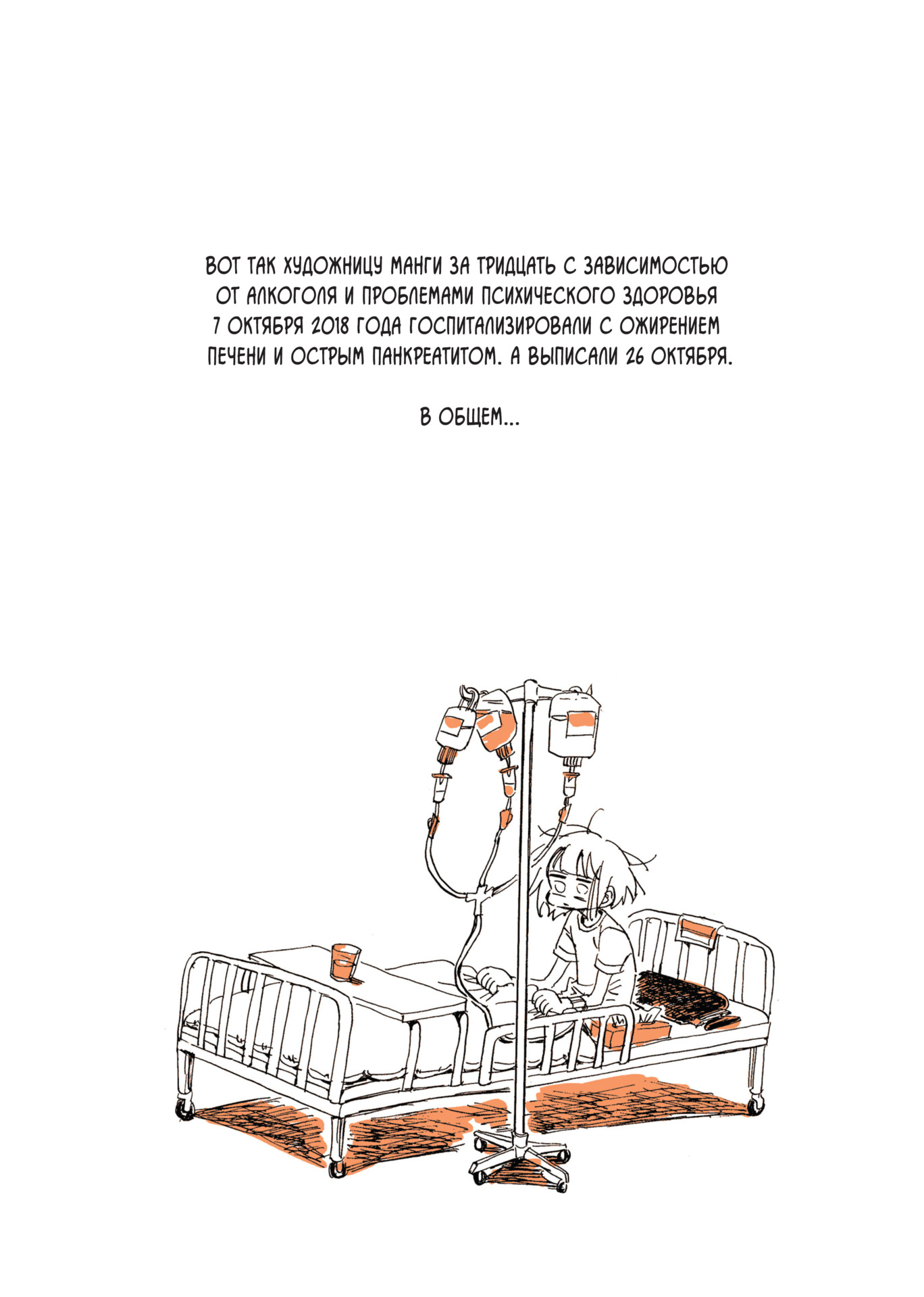 Если развитие лирической героини Каби Нагаты представить в виде графика, то Мой алкогольный побег от реальности будет являться выходом на плато, если не регрессом. Ни одна из проблем, которые были намечены авторкой в предыдущих частях, решена не была, более того, она оказалась не только в творческом кризисе, но и на больничной койке. Не стоит забывать, что Каби, на секундочку, уже тридцатник наступил, а она, как зрелая женщина, начинает ощущать, что организм у неё не резиновый. Ну вы знаете эти мемы и шутки про пажилых пенсионеров, которым исполнилось 30 лет, вот тут такая же история. Ей всего пара лет понадобилось, чтобы изнасиловать свою печень.