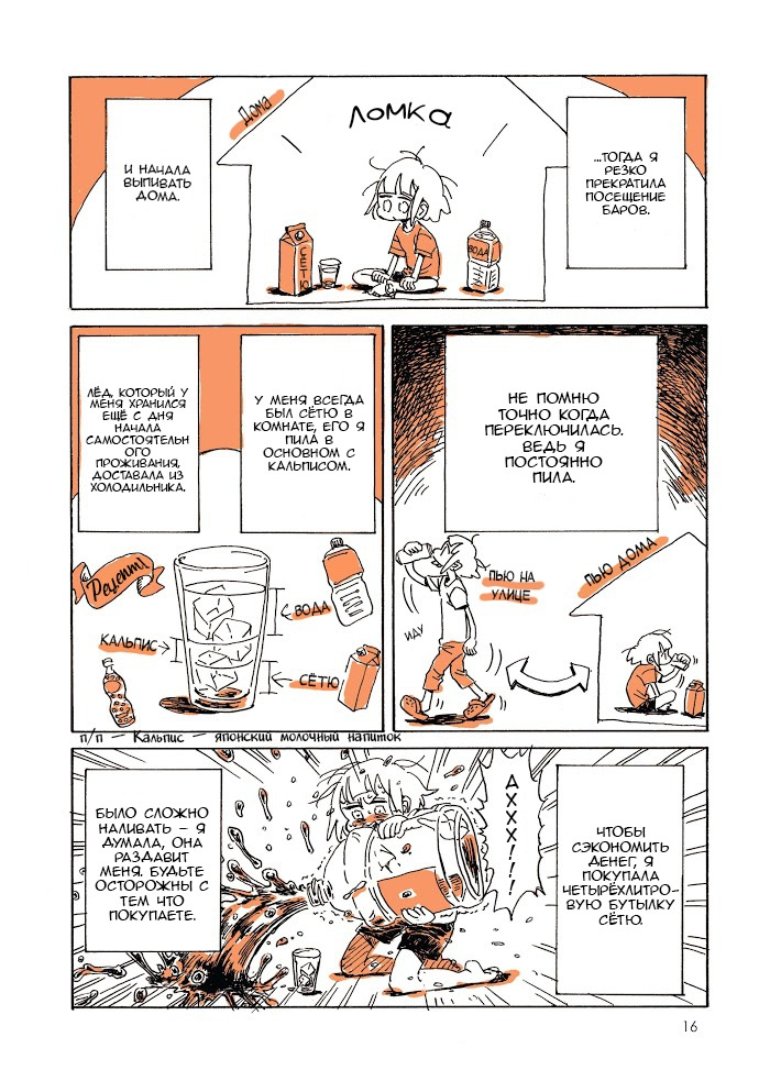 Нет, тут не будет слов осуждения Каби, мол, как она может и всё такое, просто интересно, как много она умалчивает о своей жизни и сколько всего нового мы можем узнать о ней. Ну реально, Каби в предыдущей манге вроде бы шла на поправку, а тут нате, оказывается, большую часть своего времени она пропивала заработок. Алкоголь в Японии, несмотря на возрастной ценз, достаточно доступен чтобы каждый день херачить четырёхлитровые бутыли с разбавленной водкой (крепость сётю 25 градусов, на секунду). Она, конечно, уже рассказывала про обоссанные матрацы, с кем по пьяне не случается, но блин, она допилась до абстинентного синдрома, острого панкреатита и ожирения печени. Алкоголичка дома это не хухры-мухры, я сам несколько знаком с таким и поэтому у меня в голове происходит некий диссонанс между тем, что я знаю об алкоголизме, и тем, что вижу на странице.