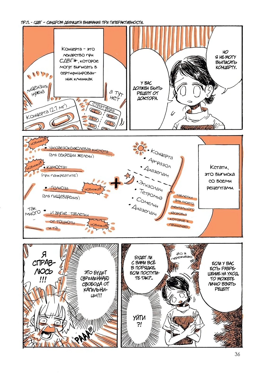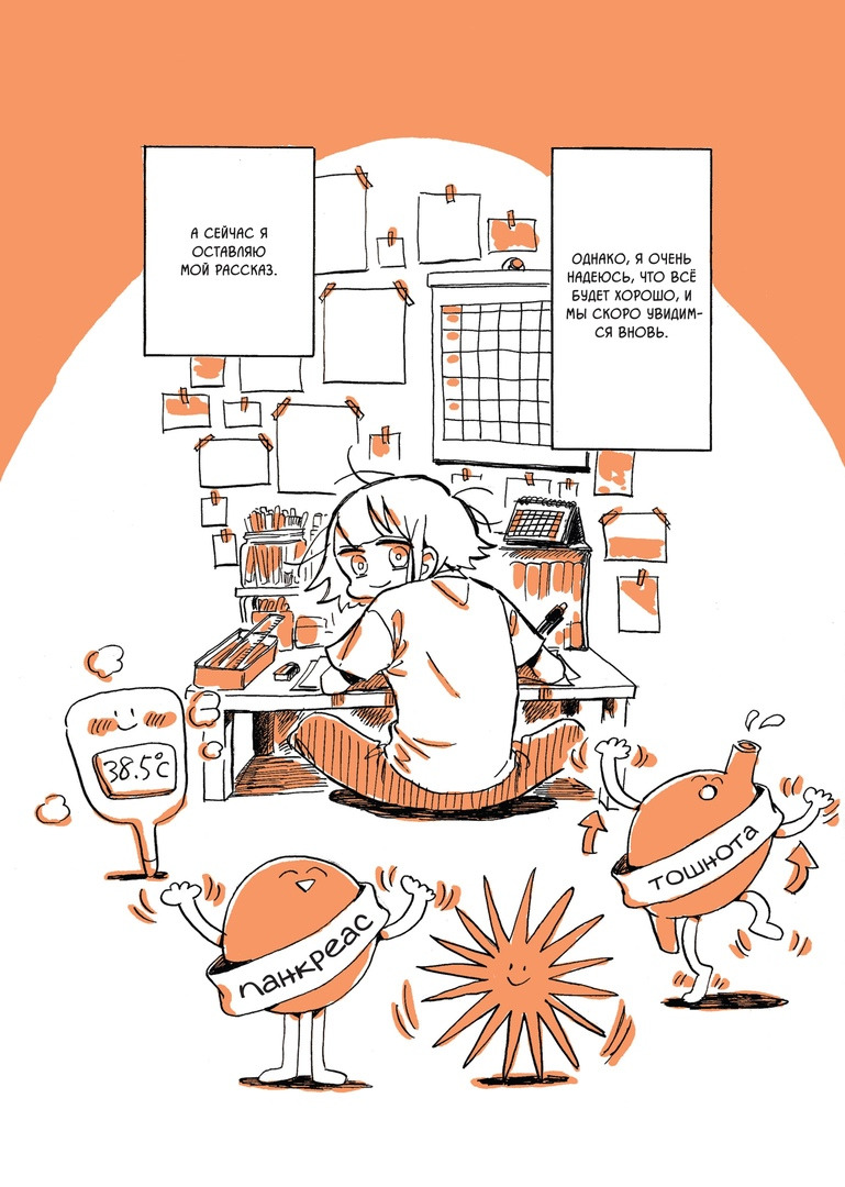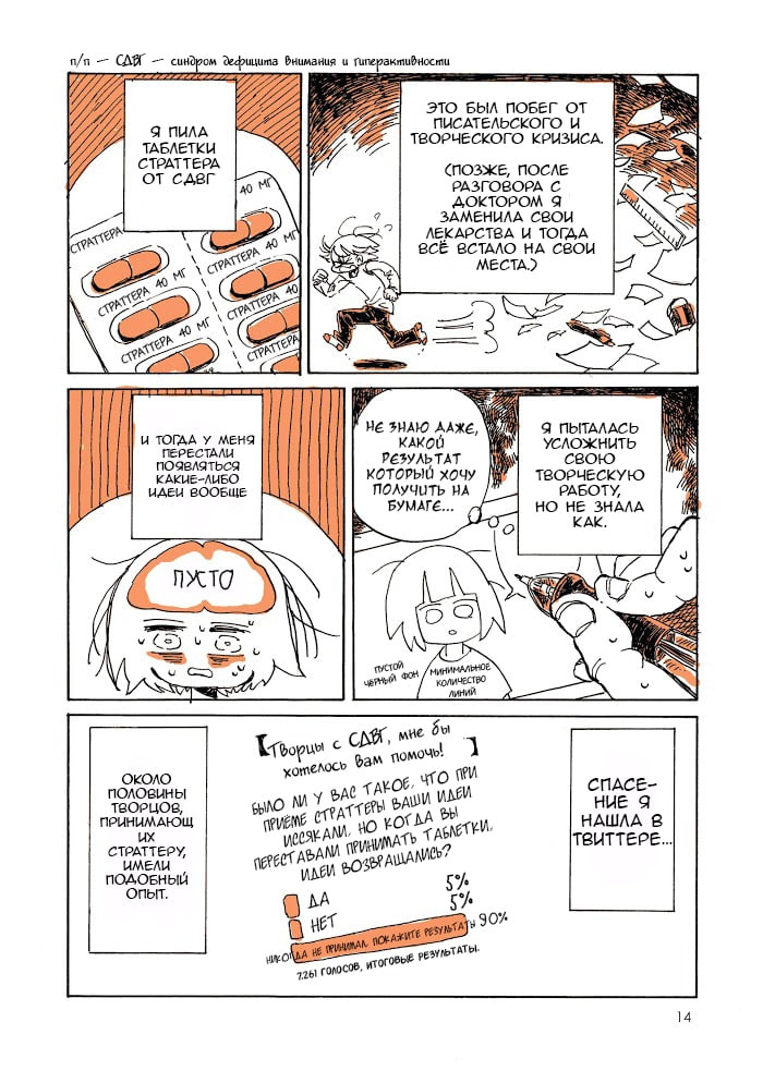 В любом случае, она за пару лет допилась до острого панкреатита и ожирения печени. Этому, собственно, посвящена большая часть рассказа - Каби выбирается одновременно из больницы и из творческого кризиса. И вот сразу скажу, круто, что она признаёт свою проблему с СДВГ. Почему-то сразу не пришло в голову, что у неё очевидная симптоматика СДВГ, который не только у детей бывает. И потому это круто, как минимум, потому что это близко и актуально для многих взрослых людей, в том числе для меня. Жаль, что она слегка коснулась этой темы, всё же интересно послушать о том, какие она принимает медикаменты и как они отражаются на её жизни.