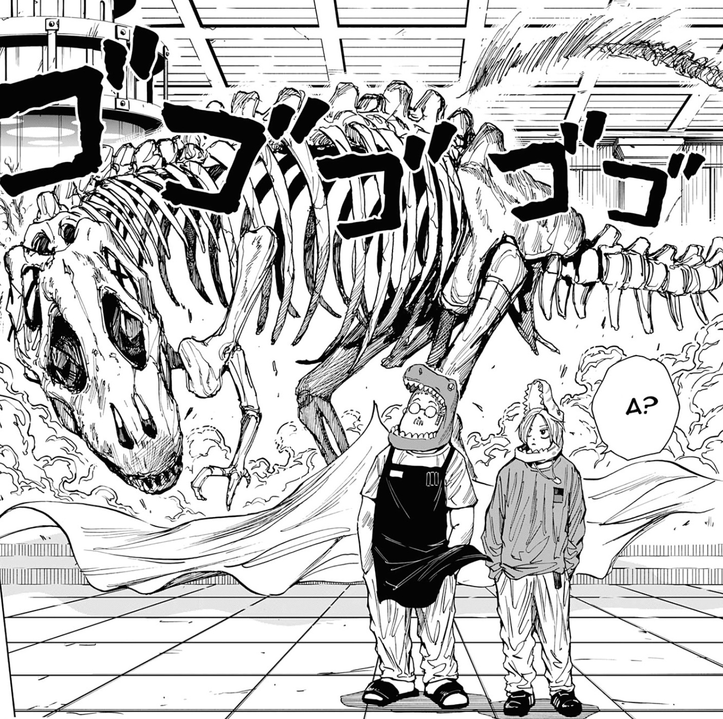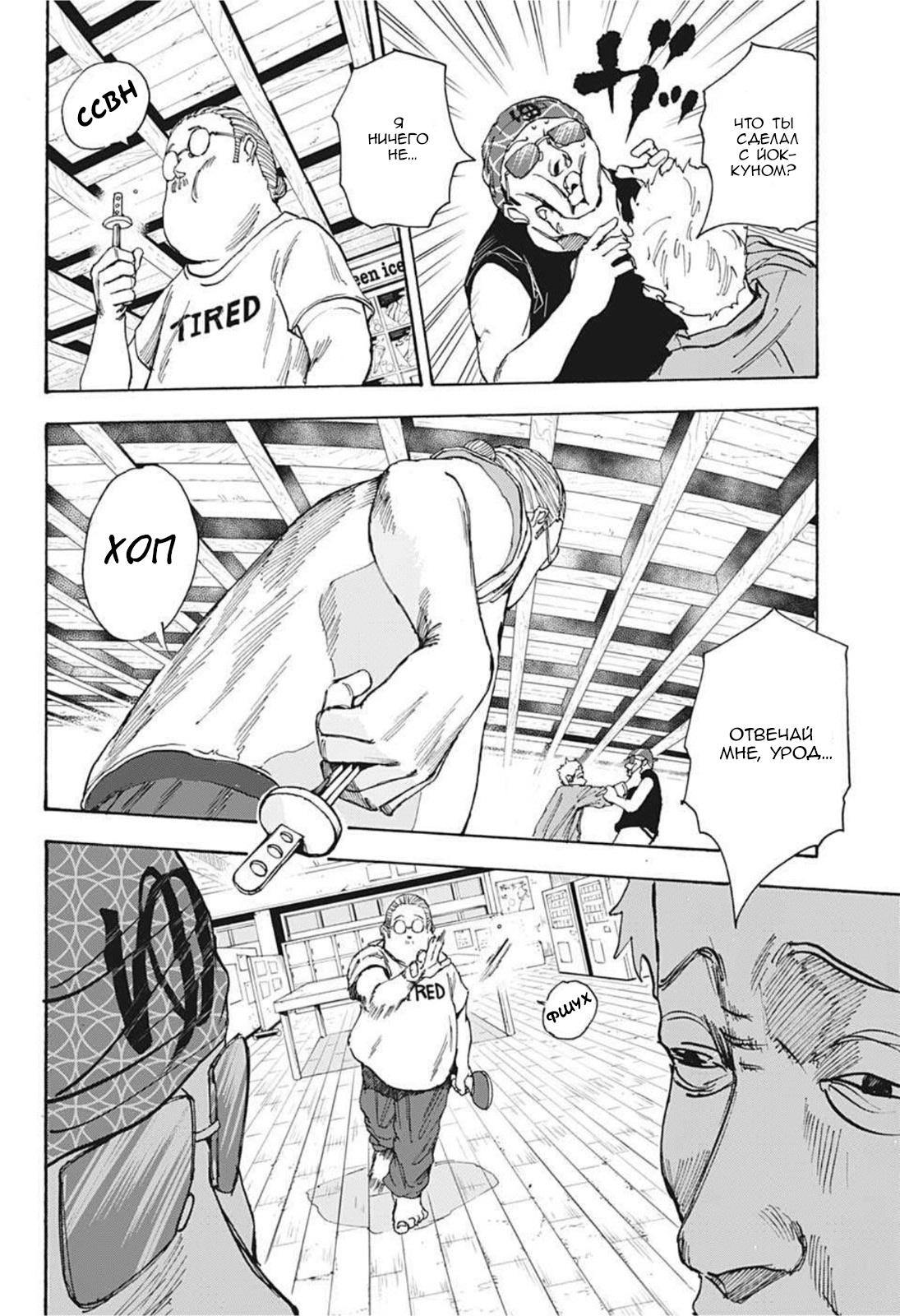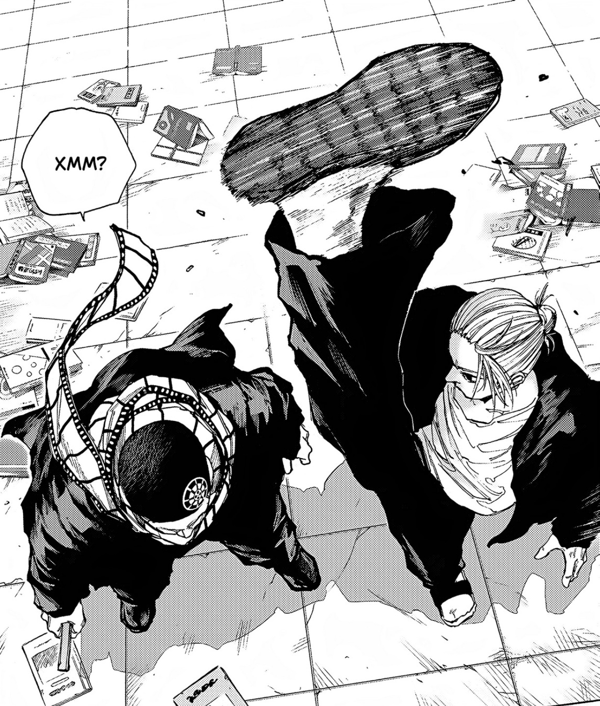 Помимо прикольных мелких арок, где просто глава-ситуация, есть тут ещё глобальный сюжет. Про него в принципе многого говорить не хочется. «Дни Сакамото» — это классический сёнэн, но не в плохом его смысле. Здесь, хоть и нету чего-то нового, однако сделан он хорошо, прямо по базе, так что даже бывалые сёнэн читатели не будут сильно скучать. По крайней мере визуал данной манги не позволит) Другими словами сюжет неплохой, но и не выдающийся. Однако знаете есть такие произведения которые сделаны чисто под молодую подростковую аудиторию. Например я недавно смотрел фильм «Годзилла и Конг: Новая империя» и вот смотря на такой кадр: